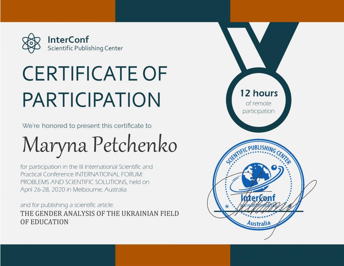 Керівник наукового відділу кандидат економічних наук Марина Петченко взяла дистанційно участь у роботі III Міжнародної науково-практичної конференції «Problems of implementation of Science into practice», яка проходила в м. Мельбурн, Австралія. Тема доповіді: «The Gender analysis of the Ukrainian field of Education». У своїй доповіді науковець зазначила, що «Курс інтеграції України до європейського суспільства передбачає дотримання вимог міжнародних програм, концепцій та стратегій щодо забезпечення гендерної рівності як в цілому, так і у сфері вищої освіти, що підтверджує актуальність цього питання. Проведене дослідження зайнятості за статтю у структурі окремих професійних груп, до яких було включено групи з найбільшим рівнем оплати праці і відповідальності та прості професії. Отримані результати підтвердили існування гендерної асиметрії в розподілі посад. Обчислене рівняння лінії тренду з середньою вірогідністю дало можливість спрогнозувати динаміку гендерної асиметрії в часі».