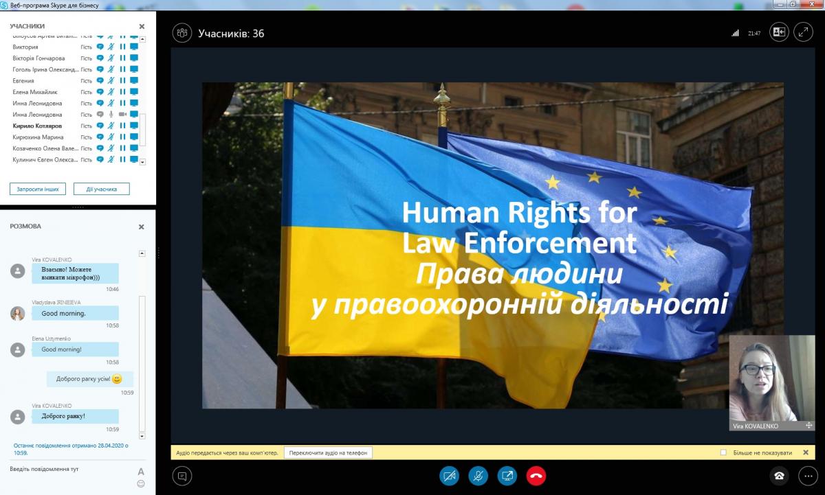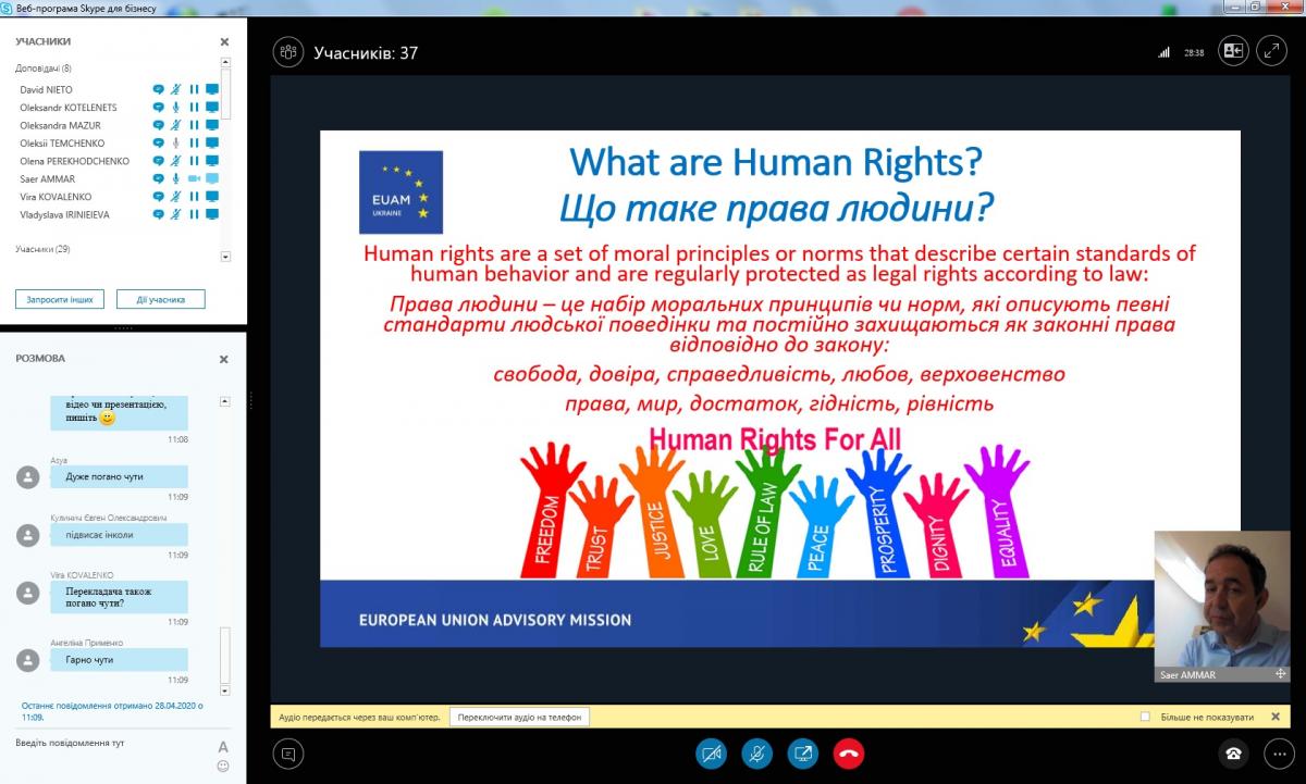 28.04.2020 року представники Кременчуцького льотного коледжу ХНУВС Людмила Олійник, Марина Кірюхіна, Ольга Хомяк, Кирило Котляров приймали участь в онлайн Дискусійному клубі англійською мовою на тему: «Права людини». Основним спікером вебінару був радник з питань верховенства права Регіонального представництва Консультативної місії Європейського Союзу у м. Харкові Саер Аммар. Радник надав вичерпні відповіді на запитання учасників вебінару.