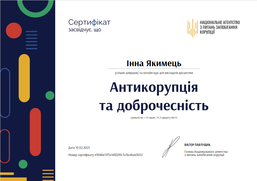 Заступниця директора коледжу з освітньої та наукової діяльності Олена Цимбалістова, начальниця відділу організації освітнього процесу Олена Черніхова, фахівець відділу організації освітнього процесу Вікторія Михасько, фахівець відділу організації освітнього процесу Яна Унковська, фахівець відділу організації освітнього процесу Інна Якимець та завідувачка відділення практичного навчання Оксана Борисенко отримали поради та знання, які допоможуть розкрити важливість антикорупції та доброчесності, а найголовніше — вплинути на формування нульової толерантності до корупції у здобувачів освіти коледжу.