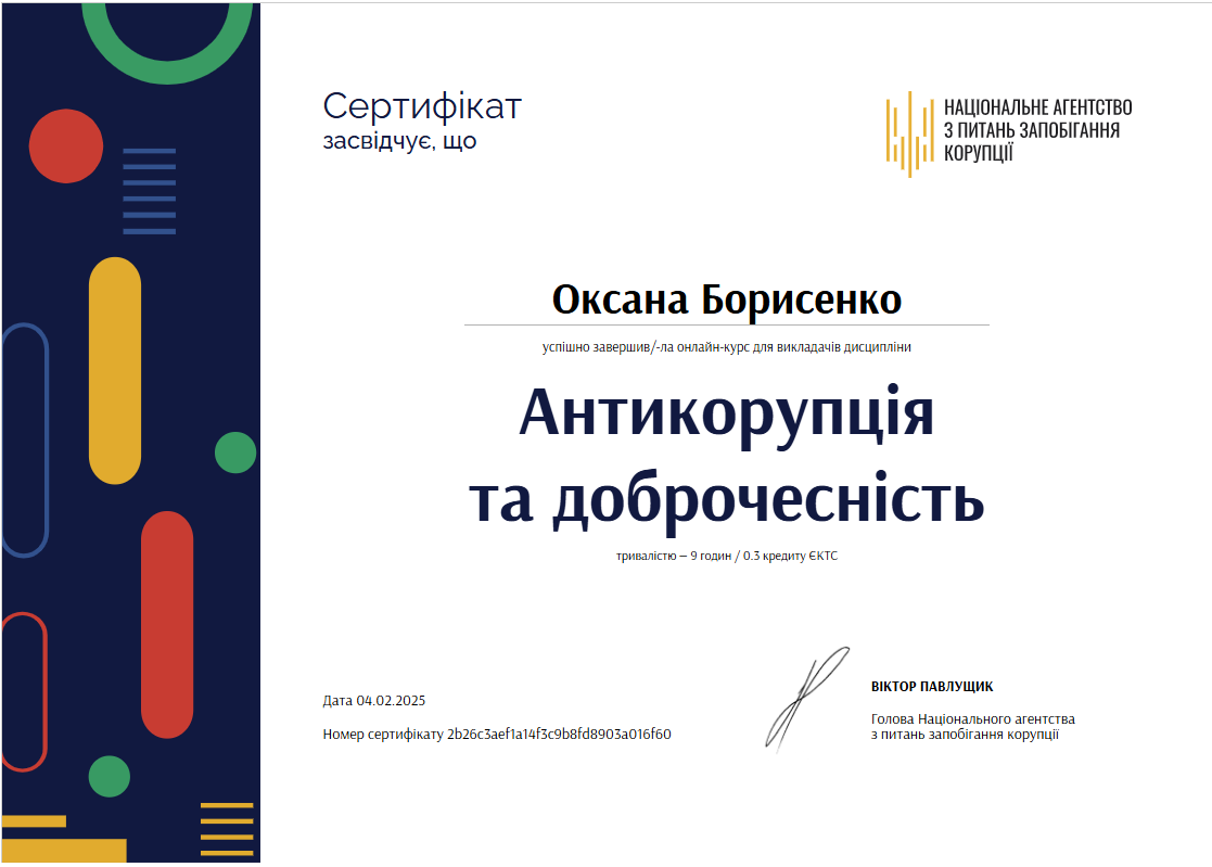 Програма курсу охоплювала теоретичні та практичні аспекти, зокрема поняття побутової корупції, її прояви та наслідки. Учасники вивчили методи підвищення ефективності навчання, такі як створення вікторин на платформі Kahoot, а також обговорили етичні дилеми, акцент було зроблено на опрацюванні механізмів запобігання корупції та впровадженню організаційних, правових та освітніх заходів, що дозволило учасникам курсу не лише зрозуміти основні засади запобігання та протидії корупції, а й сформувати конкретні навички для реалізації цих принципів у своїй професійній діяльності.