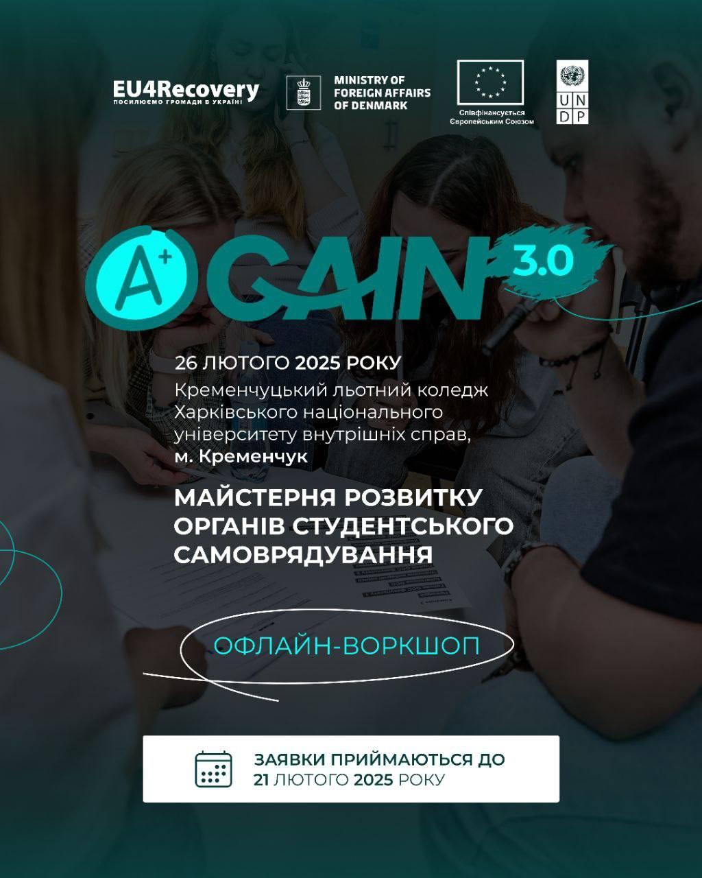 Майстерню розвитку органів студентського самоврядування “aGAIN 3.0.” організовано Програмою розвитку Організації Об’єднаних Націй (ПРООН) в Україні в межах флагманського партнерства ЄС та ПРООН «EU4Recovery – Розширення можливостей громад в Україні» та Уряду Данії.