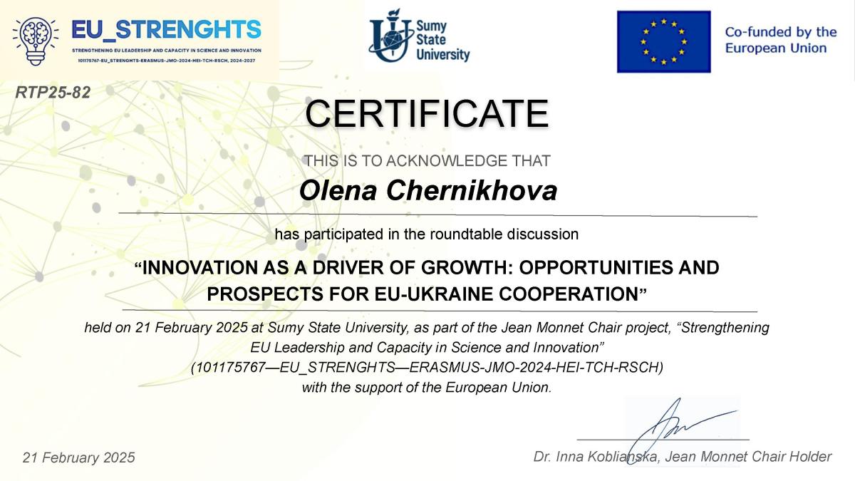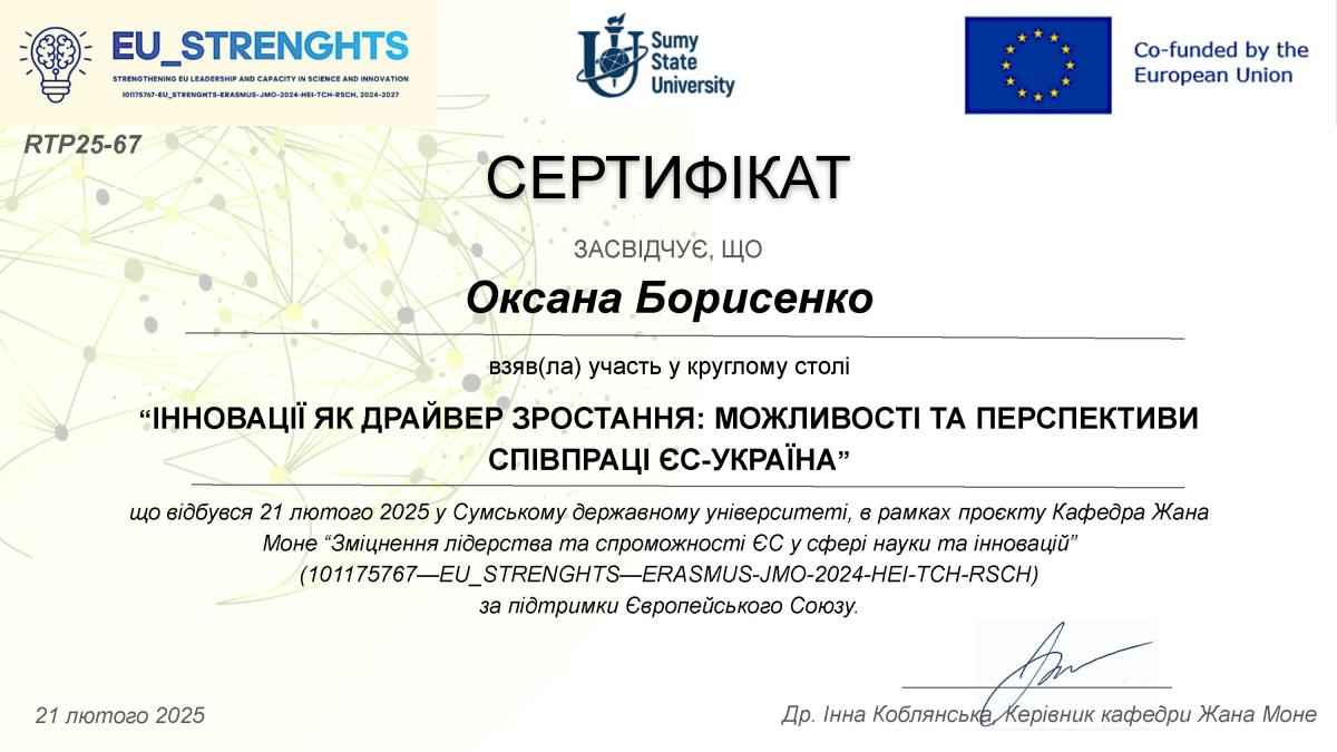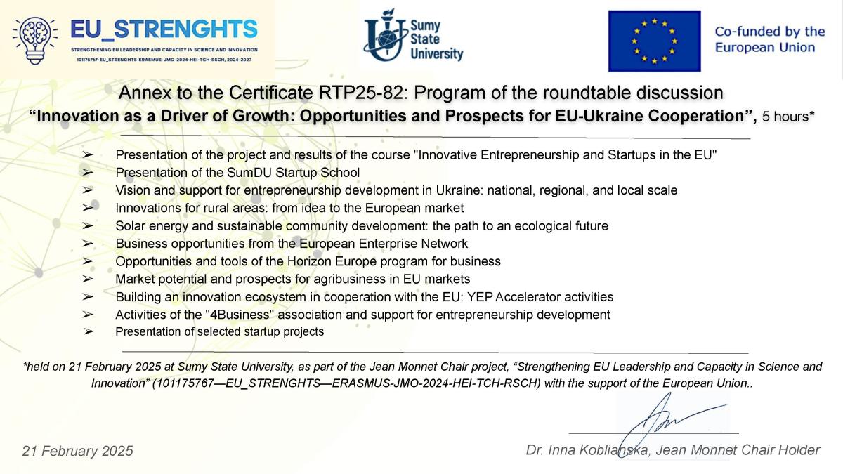 21 лютого 2025 р. начальниця відділу організації освітнього процесу Черніхова Олена Сергіївна та завідувачка відділення практичного навчання Борисенко Оксана Миколаївна доєдналися до круглого столу: ІННОВАЦІЇ ЯК ДРАЙВЕР ЗРОСТАННЯ – МОЖЛИВОСТІ ТА ПЕРСПЕКТИВИ СПІВПРАЦІ ЄС- Україна на базі Сумського державного університету.