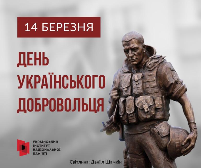 14 березня в Україні відбувається вшанування добровольців – людей, які не були військовими за професією, але в критичний для держави момент без повісток чи примусу, добровільно «поставили на паузу» своє попереднє життя й узяли до рук зброю, щоб захистити країну.