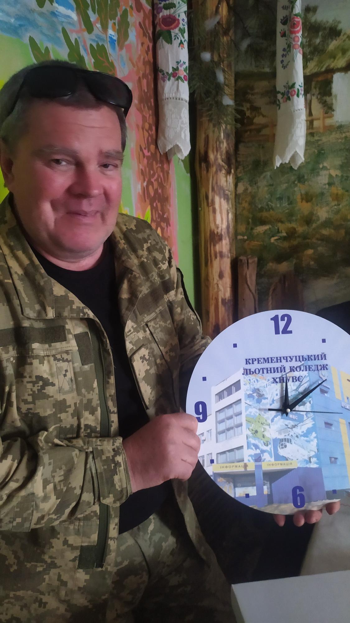 На згадку про Кременчуцький льотний коледж здобувачі освіти подарували Кременчуцькому ветеранському центру реабілітації учасників та інвалідів війни годинник з логотипом навчального закладу.