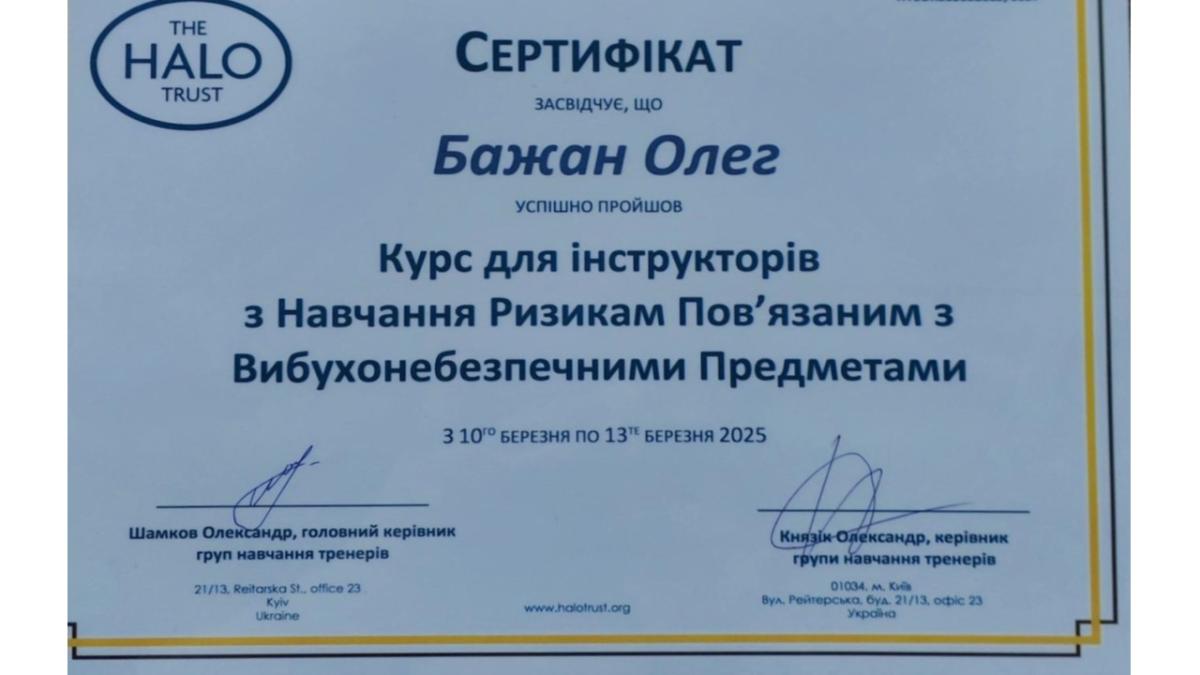 життя і здоров’я співгромадян. По завершенні навчального курсу всі учасники отримали міжнародний сертифікат інструктора з навчання ризикам пов’язаним з вибухонебезпечними
