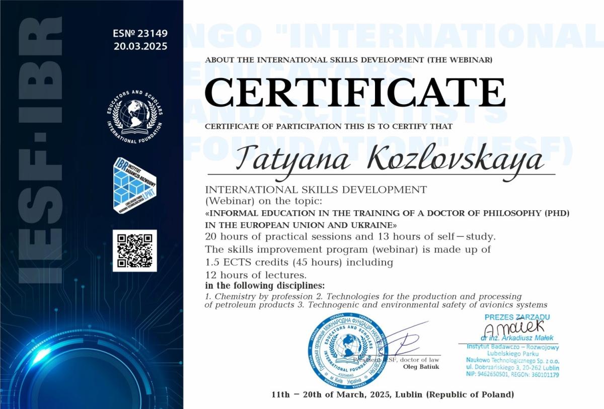 У період з 11 по 20 березня 2025 року завідувачка кафедри авіаційного транспорту, кандидат хімічних наук, доцент Тетяна Козловська взяла участь у Міжнародному підвищенні кваліфікації (вебінар) на тему: «Неформальна освіта у підготовці доктора філософії (PhD) в країнах Європейського Союзу та Україні».