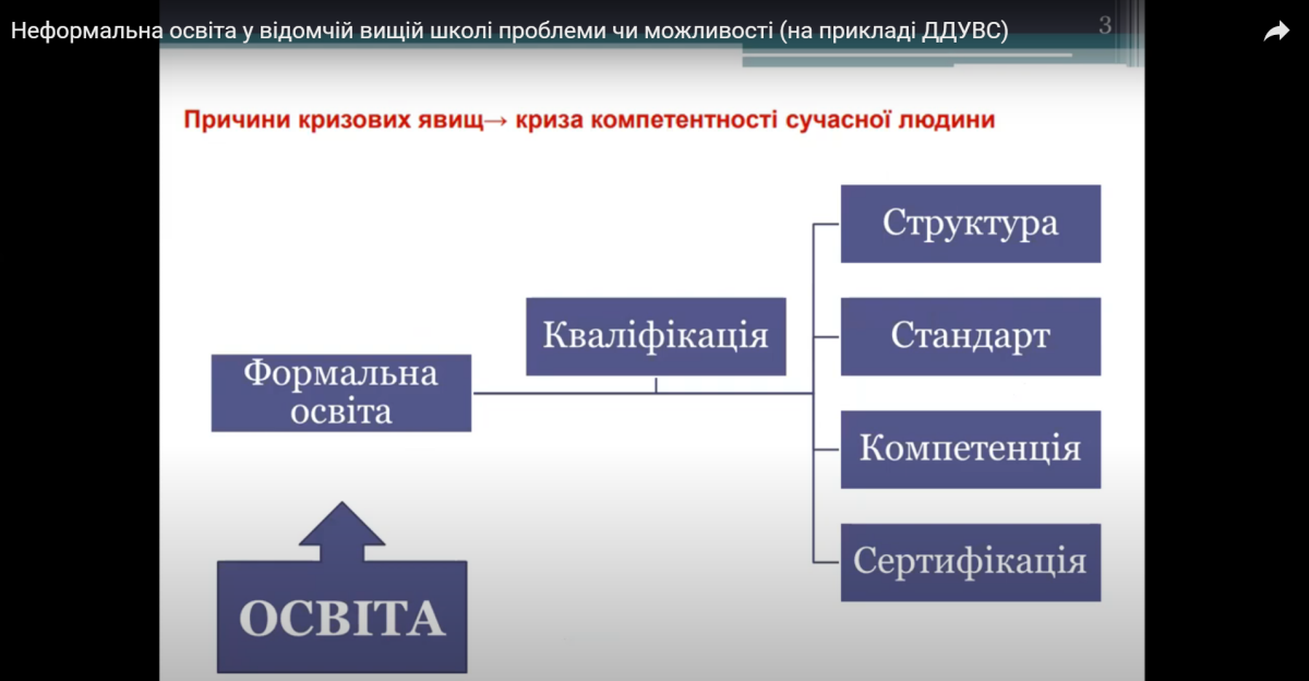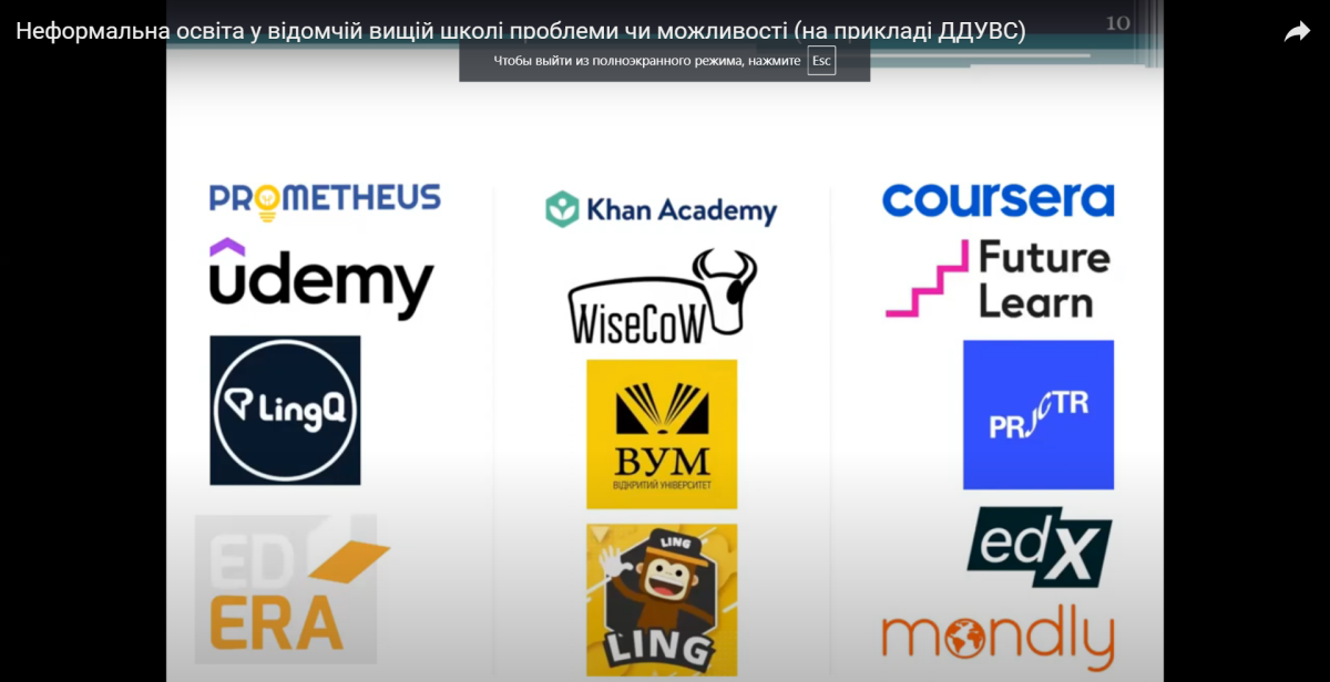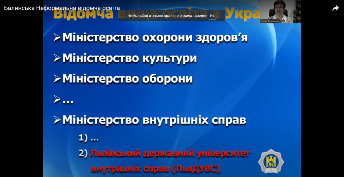 Цікаво і всебічно були висвітлені питання неформальної освіти у відомчій вищій школі – на прикладах Львівського державного університету внутрішніх справ України та Дніпровського державного університету внутрішніх справ України.