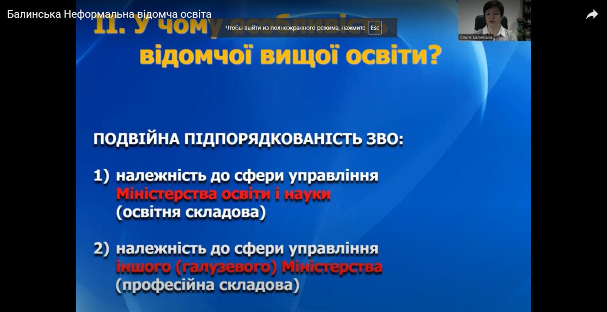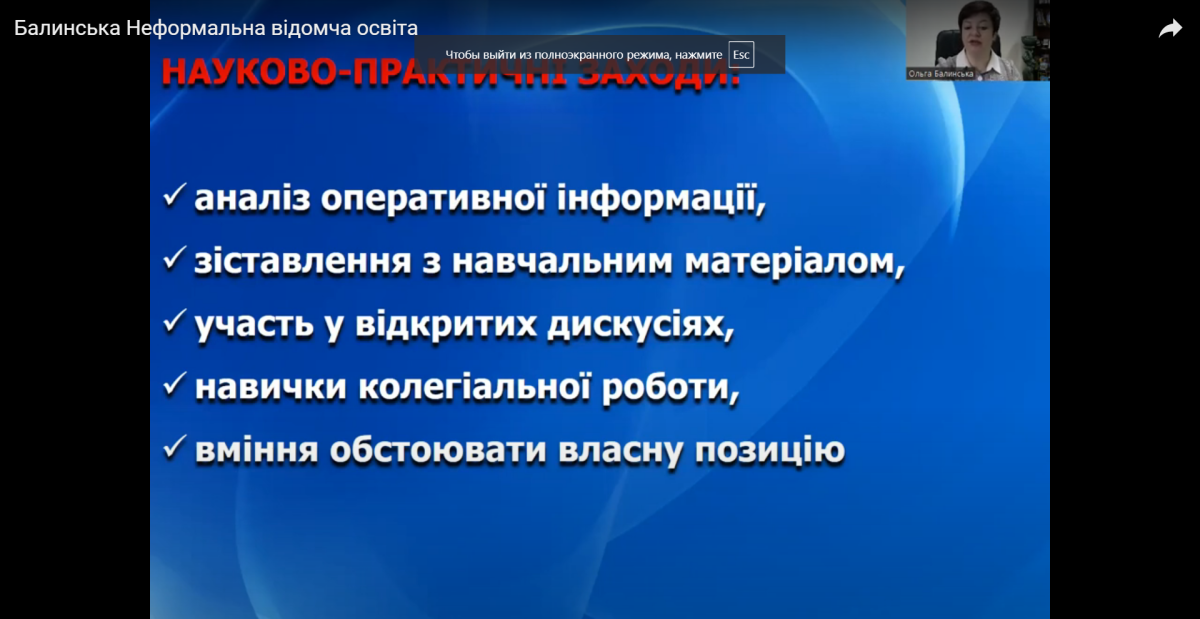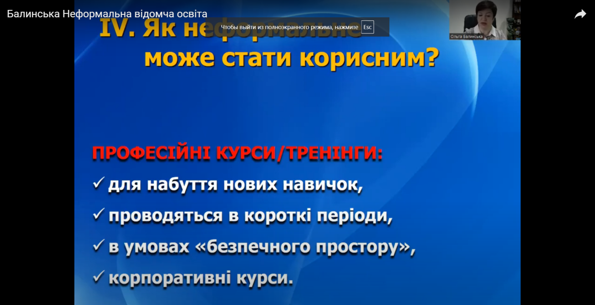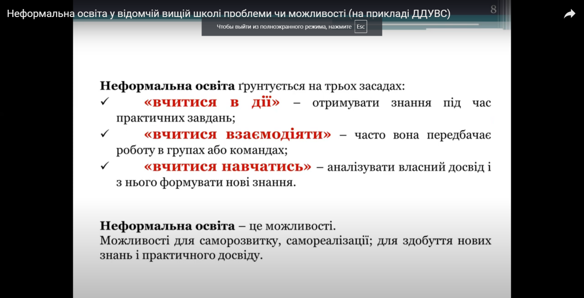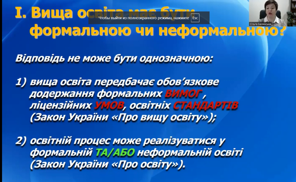 Опанування матеріалів вебінару дозволило отримати відповіді на важливі питання: чи повинна вища освіта бути формальною чи неформальною; у чому полягають особливості неформальної освіти; чи є вся освіта неформальною; чи може формальна освіта бути корисною?