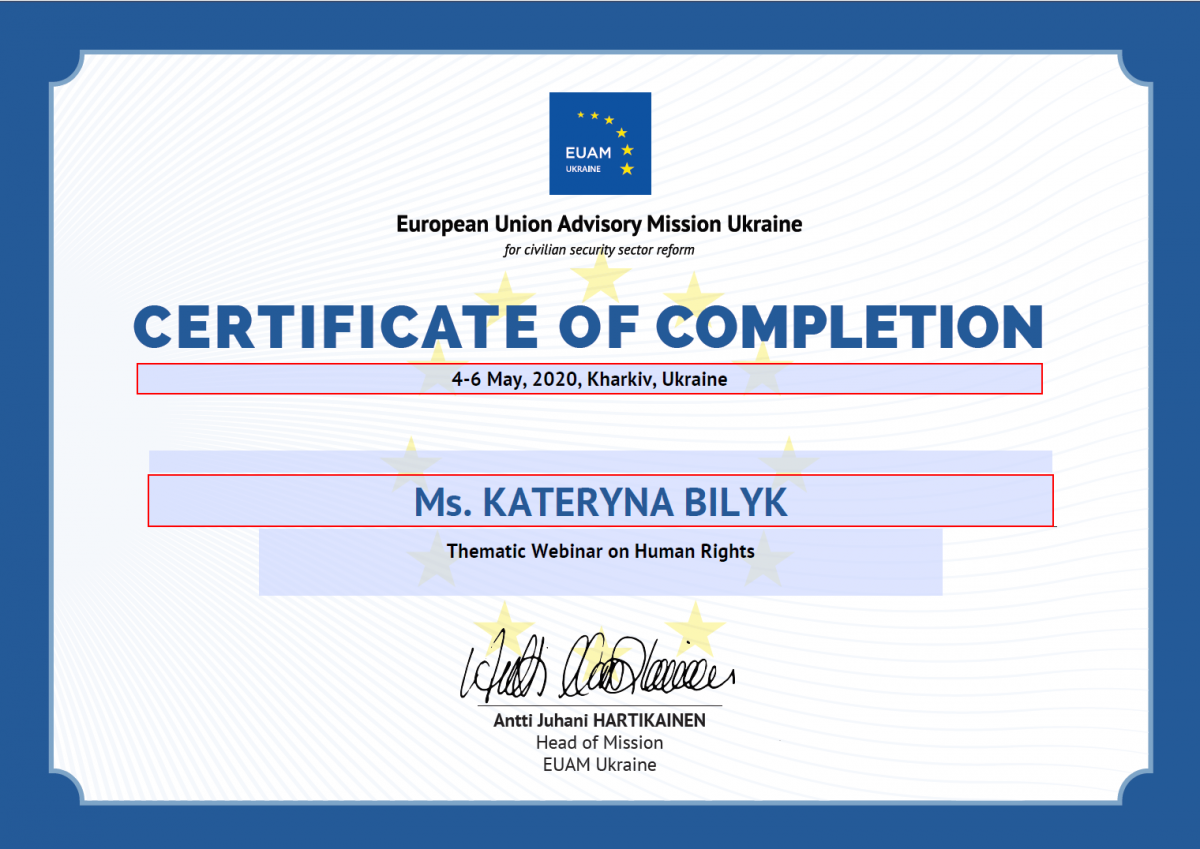 Студентка навчальної групи БОдбср-18-1 Білик Катерина прийняла участь у триденному воркшопі на тему «Права людини» під час онлайн семінару Саер Аммар, радник з питань верховенства права Регіонального представництва КМЄС у м. Харкові, ознайомив здобувачів вищої освіти з основними правами людини, звернув увагу на міжнародні та регіональні документи у галузі прав людини. Крім того, було наголошено, що Україна є членом Ради Європи та учасницею Конвенції про захист прав людини і основоположних свобод. Протягом трьох днів розглядалися питання дотримання прав людини, заборони дискримінації у правоохоронній діяльності, права людини під час розслідування, чому стандарти прав людини можливо застосовувати у поліцейській діяльності, права людини у надзвичайних ситуаціях, вплив коронавірусу на окремі соціальні групи тощо. По завершенню усі учасники отримали сертифікати про участь від Консультативної місії Європейського Союзу.