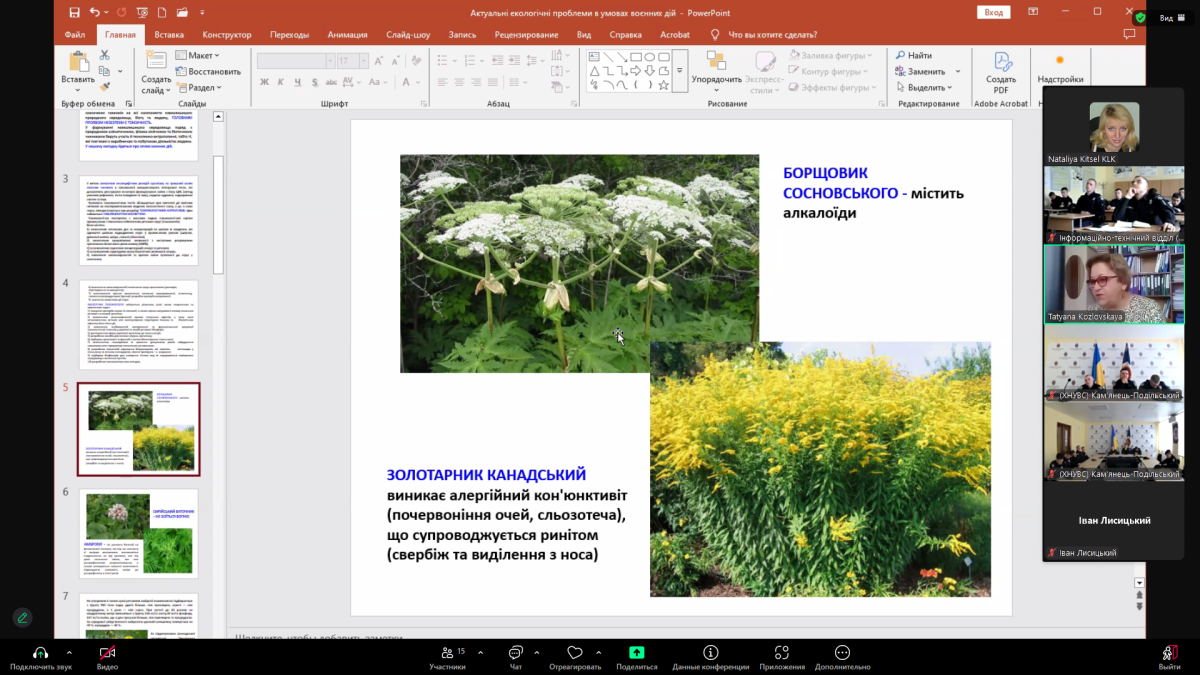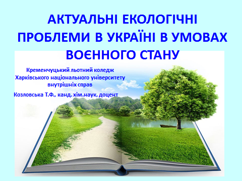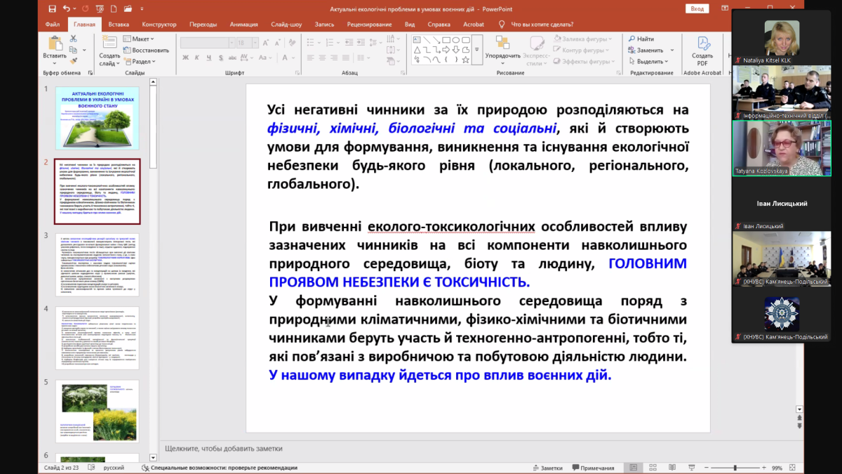 24 квітня 2025 року відбулось чергове факультативне заняття Школи наукового лідерства ХНУВС, яке провела завідувачка кафедри авіаційного транспорту Кременчуцького льотного коледжу Тетяна КОЗЛОВСЬКА. Вона підготувала для здобувачів освіти інтерактивну презентацію за темою «Актуальні екологічні проблеми в Україні в умовах воєнного стану». У своїй презентації Тетяна Козловська проаналізувала вплив фізичних, хімічних, біологічних і соціальних чинників на стан навколишнього середовища, звернула особливу увагу на проблеми використання хімічних речовин і реагентів у процесі проведення судово-технічної експертизи.