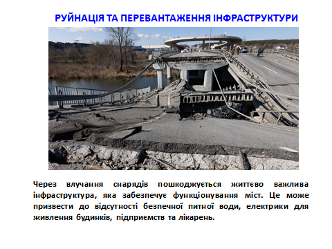 Окремо було висвітлено вплив бойових дій на поширення небезпечних рослин, загибель тварин, забруднення ґрунтів, а також наслідки застосування фосфорних боєприпасів для організму людини й довкілля. Було також розглянуло наслідки обстрілів і пожеж у містах та їхній вплив на виникнення захворювань у цивільного населення.