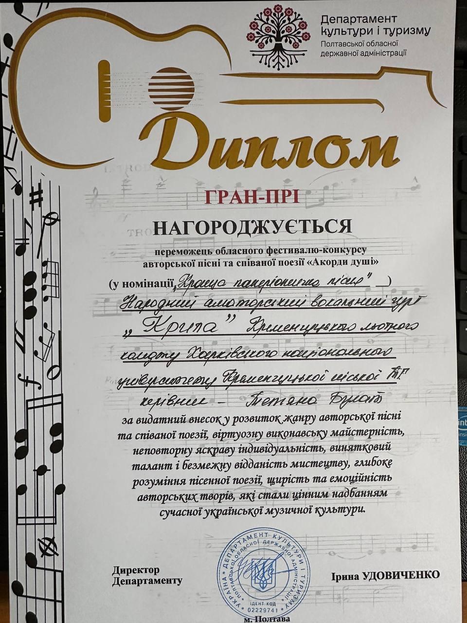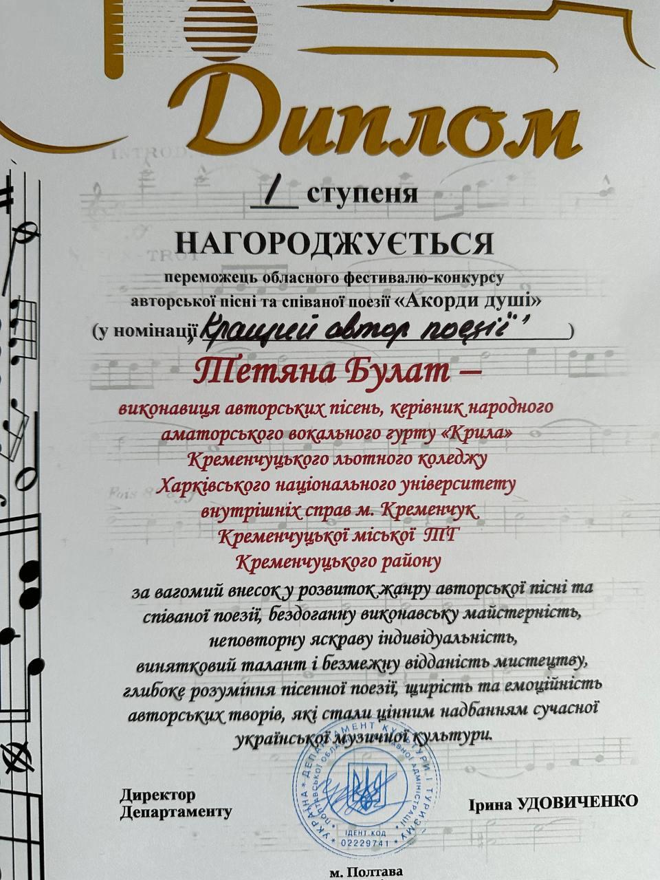 12 червня 2025 року у місті Полтава відбувся обласний фестиваль-конкурс авторської пісні та співаної поезії "Акорди душі", в жюрі якого були Директорка департаменту культури і туризму Полтавської обласної військової адміністрації Ірина Удовиченко, заслужена артистка України Наталія Сулаєва, заслужений діяч мистецтв України Владислав Шевченко, заслужений працівник культури України Євген Дудник, представники обласного Центру народної творчості та культурно-освітньої роботи. Також на святі був присутній заступник голови Полтавської обласної військової адміністрації Антон Чубенко.