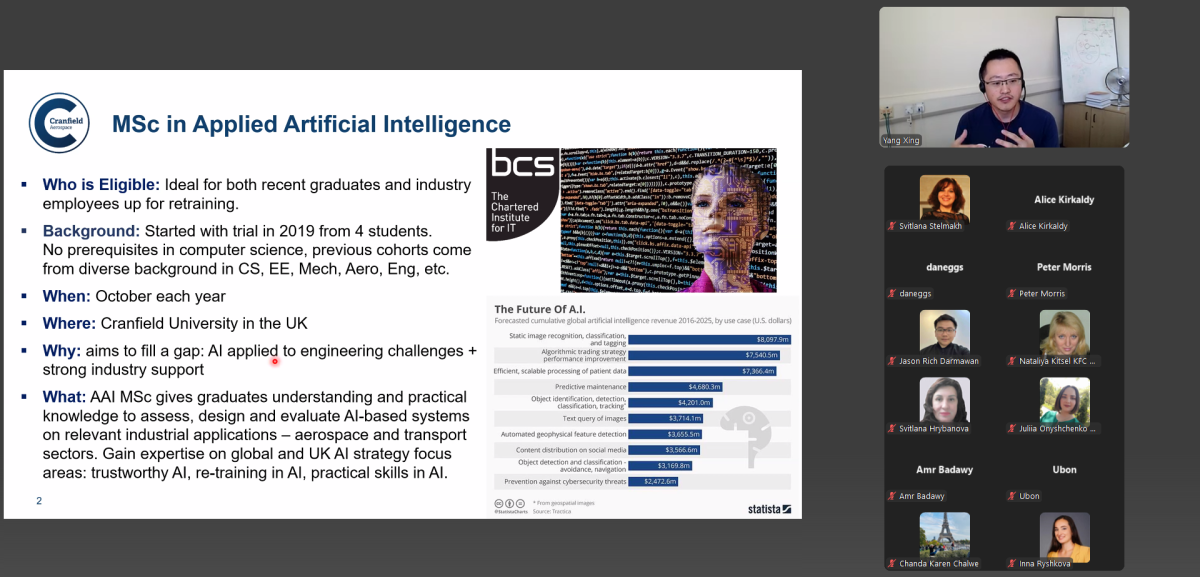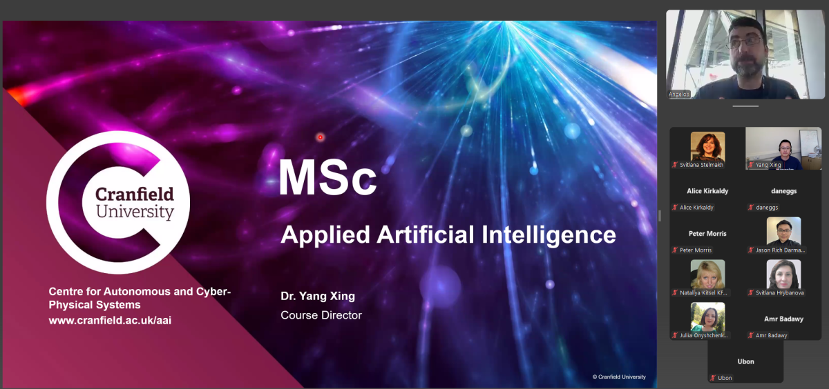 16 червня за запрошенням потенційного міжнародного партнера Університету Кренфілда (Велика Британія) представники Кременчуцького льотного коледжу ХНУВС приєднались до онлайн-вебінару, присвяченого магістерській програмі з прикладного штучного інтелекту в Університеті Кренфілду (Велика Британія) — потенційного міжнародного партнера.