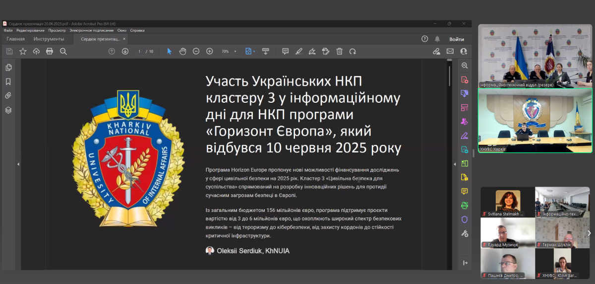 10 червня 2025 року – участь в інформаційному дні для НКП за напрямом кластеру 3. Від України участь взяв Олексій Сердюк, НКП з напряму «Цивільна безпека для суспільства», Харківський національний університет внутрішніх справ.