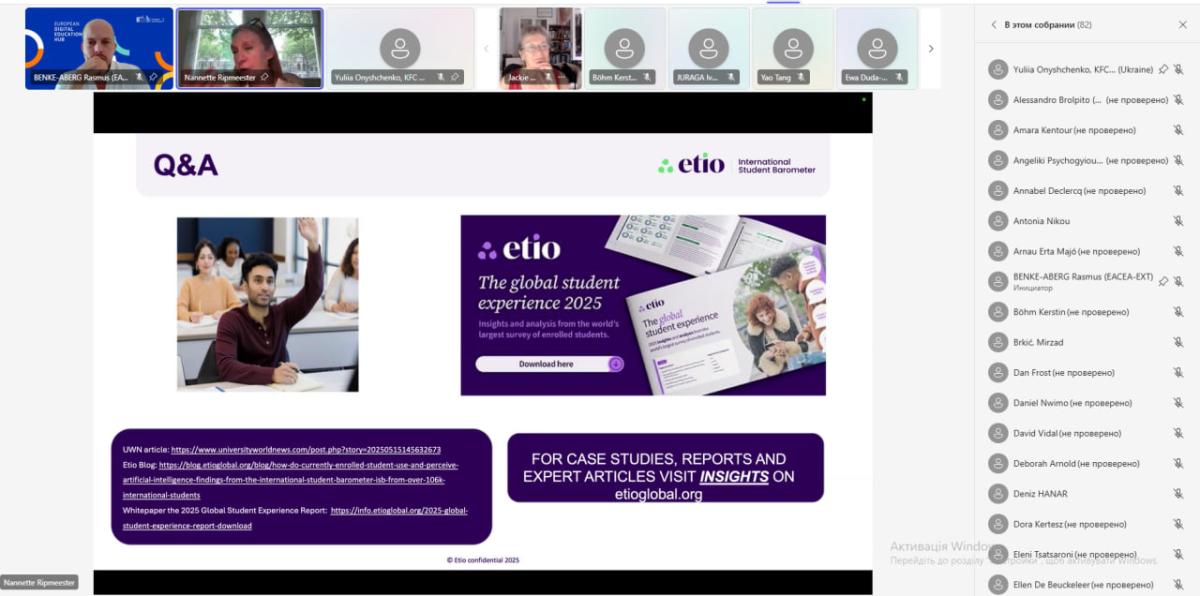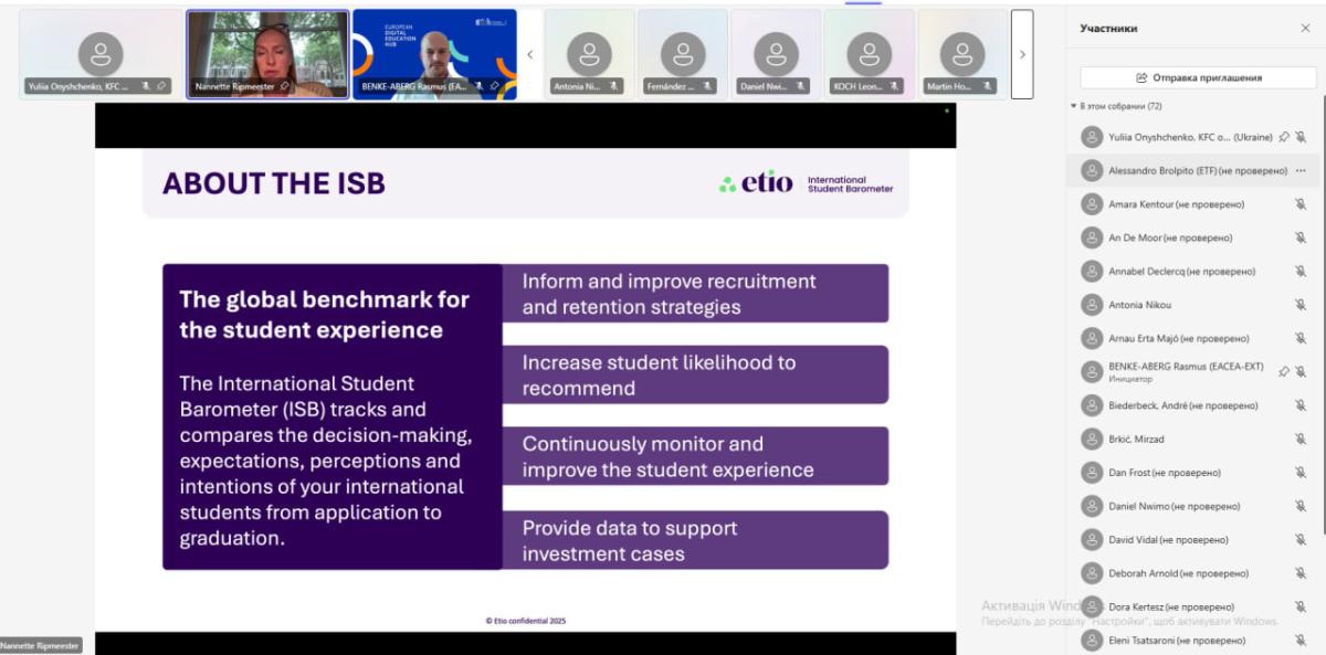 Вебінар був присвячений аналізу результатів щорічного опитування "Міжнародний студентський барометр" (International Student Barometer - ISB) – найбільшого у світі студентського опитування, що цього року зосереджувалось на використанні штучного інтелекту (ШІ) в освіті охопило понад 100 000 іноземних студентів. Результати опитування представила Наннет Ріпмістер, засновниця та директорка Expertise in Labor Mobility, а також регіональний директор з опитувань у Європі та Північній Америці в Etio (раніше i-graduate), організації, що відповідає за проведення Міжнародного студентського барометра.