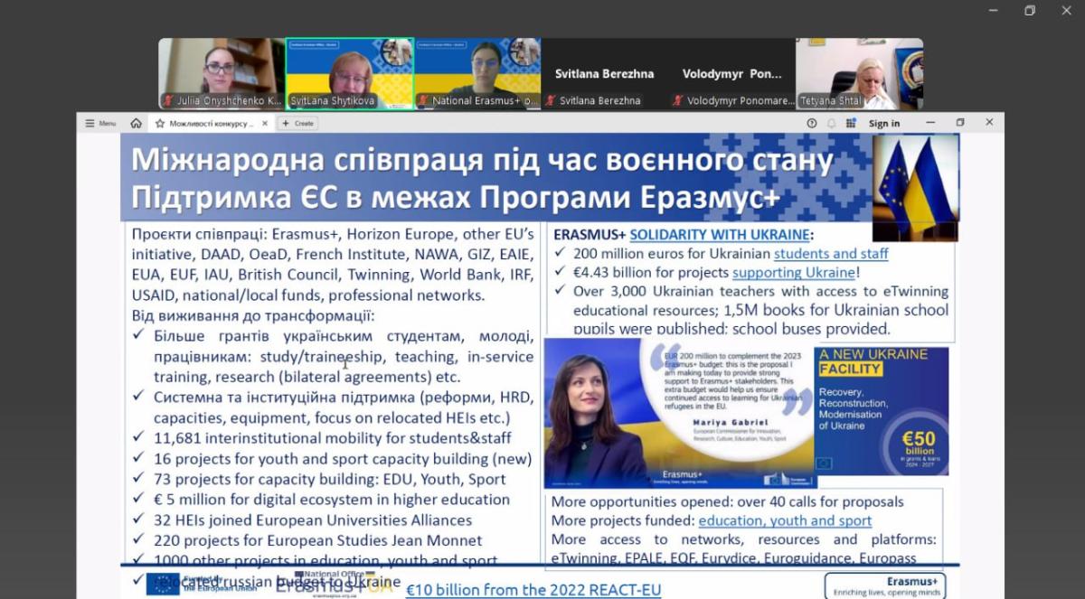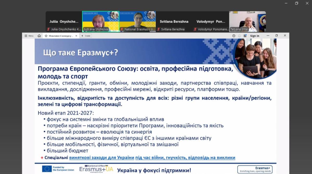 Метою семінару-тренінгу було підвищення обізнаності учасників щодо правил і особливостей реалізації проєктів Erasmus+ в умовах воєнного стану. Спікерами зустрічі були Світлана Шитікова, координаторка Національного офісу Erasmus+ в Україні та Жанна Таланова, інституційна координаторка Еразмус+ ЗВО України, які представили правила участі в проєктах академічної мобільності в рамках Програми ЄС Еразмус+ та реальність їх реалізації під час воєнного стану. Також, Ірина Штеймілер, начальник управління міжнародних відносин Харківського національного університета імені В. Н. Каразіна поділилася досвідом організації міжнародної діяльності в її закладі та участі в програмах міжнародної академічної мобільності. Учасники семінару мали змогу обговорити стратегії розвитку закладів вищої освіти в контексті євроінтеграції, питання налагодження горизонтальної співпраці між українськими та європейськими університетами, важливість забезпечення інклюзивної мобільності для всіх категорій студентів і викладачів, а також механізми визнання результатів навчання та періодів мобільності. Крім того, обговорили шляхи вирішення проблем, що виникають під час реалізації проєктів, а також визначили інституційний вплив таких проєктів.