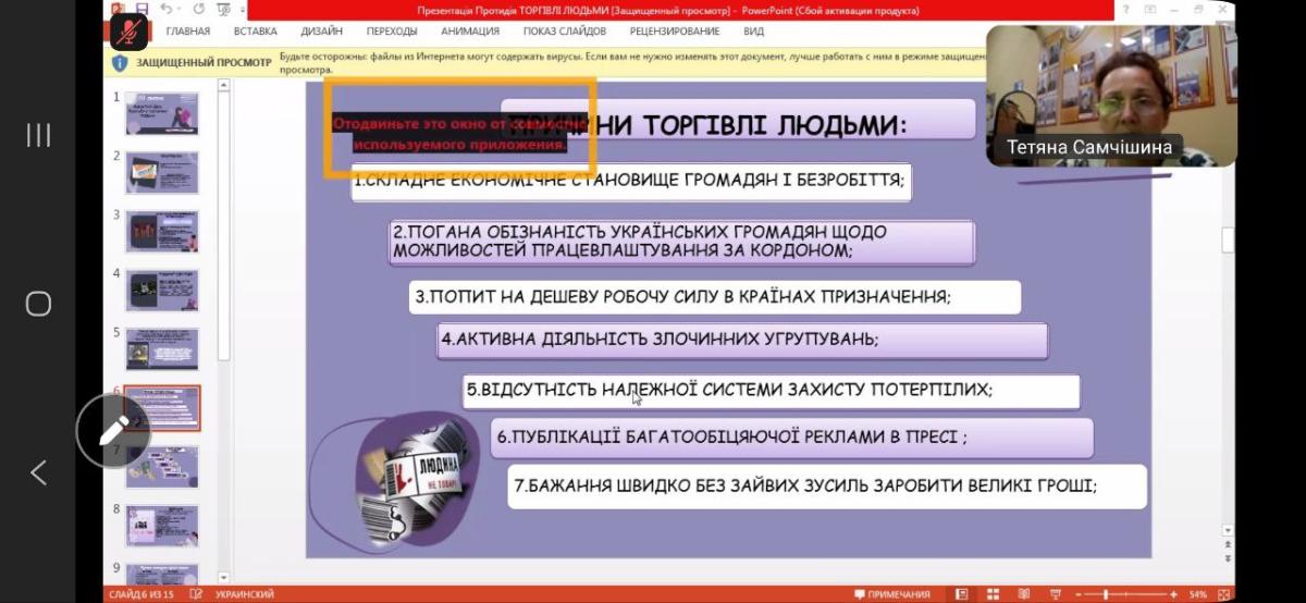 Фахівець надав учасникам заходу корисну інформацію про види торгівлі людьми, ознаки небезпечних ситуацій, поширені міфи та правила безпечної поведінки. Присутні також отримали практичні поради, які допоможуть уникнути ризику стати жертвою цього злочину як в Україні, так і за кордоном.