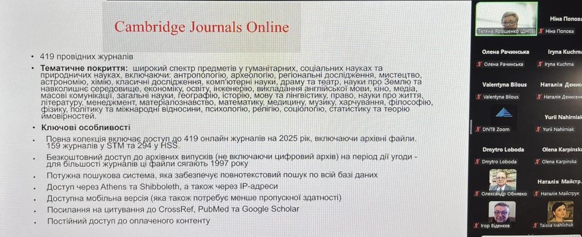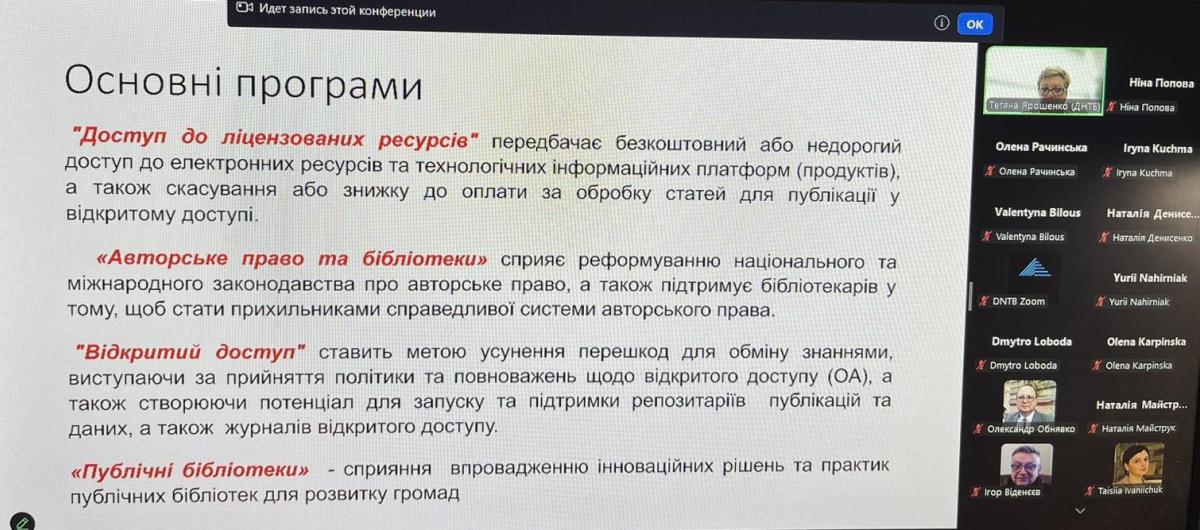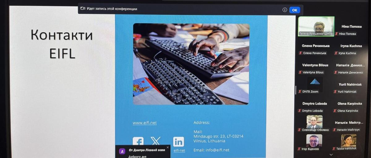 Під час вебінару були розлянуті ключові напрямки роботи Національного Консорціуму EIFL-Україна: доступ до ліцензованих ресурсів; авторське право та бібліотеки; розвиток відкритого доступу; роботу з публічними бібліотеками; умови приєднання до Консорціуму; можливості отримання електронних ресурсів безоплатно або зі знижками для його учасників.
