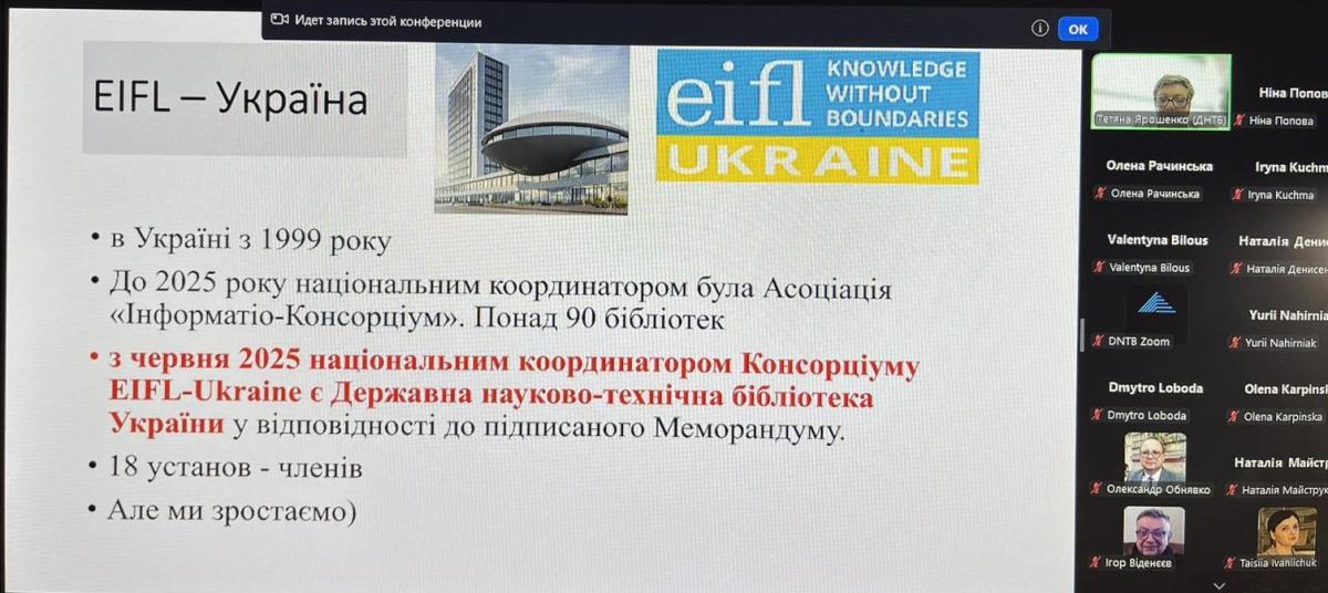 11 вересня 2025 року завідувачка загальної бібліотеки коледжу Ніна Попова за сприяння групи міжнародних зв’язків та міжвузівської роботи взяла участь у вебінарі «Партнерство EIFL-Україна: новий етап співпраці та розвитку», присвяченому діяльності Національного Консорціуму EIFL-Україна та шляхам отримання доступу до електронних ресурсів безкоштовно або на пільгових умовах для його учасників.