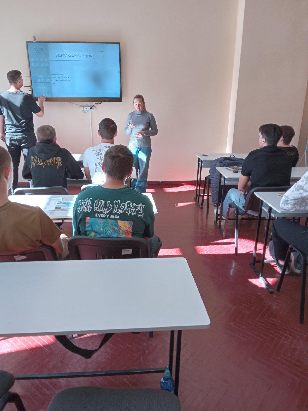 Особливу зацікавленість у здобувачів вищої освіти викликала розповідь про різноманітні види повітряних суден, їх конструкційні особливості і можливість застосування для видів робіт у різних галузях, зокрема, збір інформації, її обробка за допомогою ІТ-технологій та ШІ-інтелекту, моніторинг стану сільського господарства, водних об’єктів, технологічного обладнання та відповідних процесів, розливах нафти і пально-мастильних матеріалів, визначення осередків пожеж, аварійних станів трубопроводів, встановлення рівнів забруднення складових навколишнього природного середовища тощо.