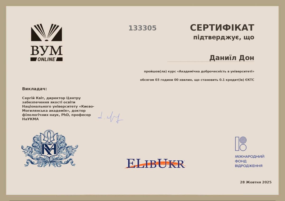 За сприяння та консультативної підтримки відповідальної з академічної доброчесності Коледжу, кандидата економічних наук, начальника відділу організації наукової діяльності Людмили Олійник Голова та представники Курсантсько-студентської ради Коледжу Маргарита Капцевич, Аліса Морозова, Андрій Носаненко, Андрій Юрченко, Артем Хоменко, Богдан Пузир, Владислав Варваринець, Даниїл Дон, Данил Безпарточний, Денис Соломон, Михайло Серідко, Олег Литвинов та Руслана Пономаренко у жовтні 2025 року пройшли навчання на онлайн-платформі «ВУМ-online» за курсом «Академічна доброчесність в університеті».