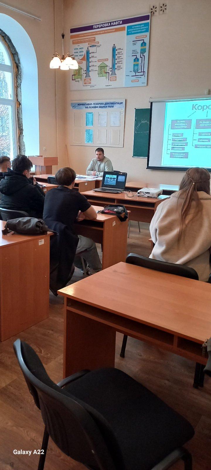 У ході бінарного заняття інженером – конструктором Валентином Клепачем на прикладах із своєї практичної діяльності було закцентовано увагу здобувачів на вивченні даної дисципліни як основи для розуміння властивостей матеріалів, способів їх виготовлення, обробки та належної експлуатації деталей та вузлів авіаційної техніки, а також їх захисту від корозійних руйнувань. Активно обговорювалися питання стосовно сутності корозії та її видів, основні засоби захисту від корозії, негативного впливу корозійних процесів на функціонування повітряних суден.