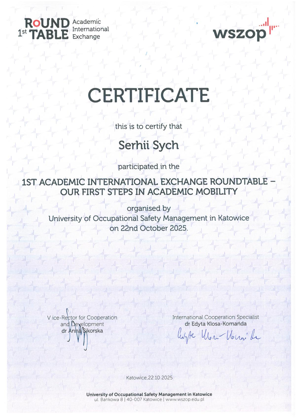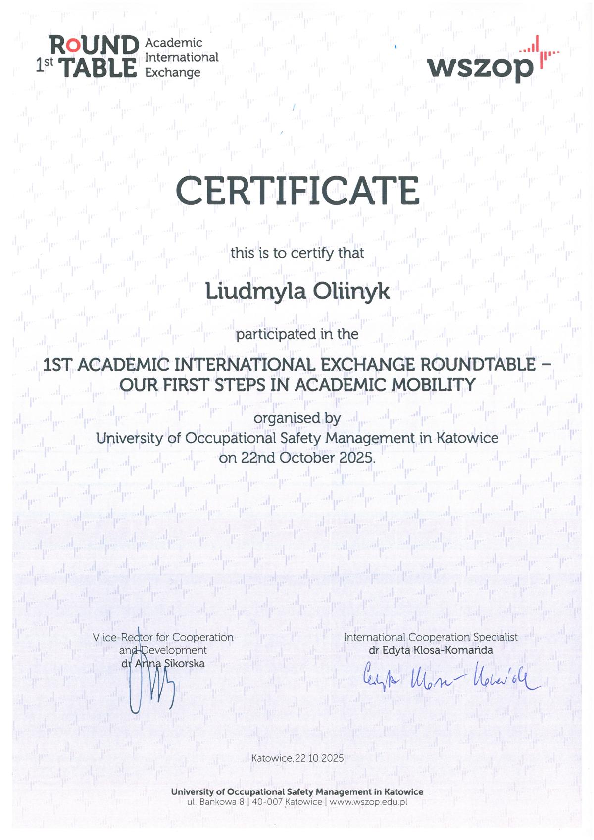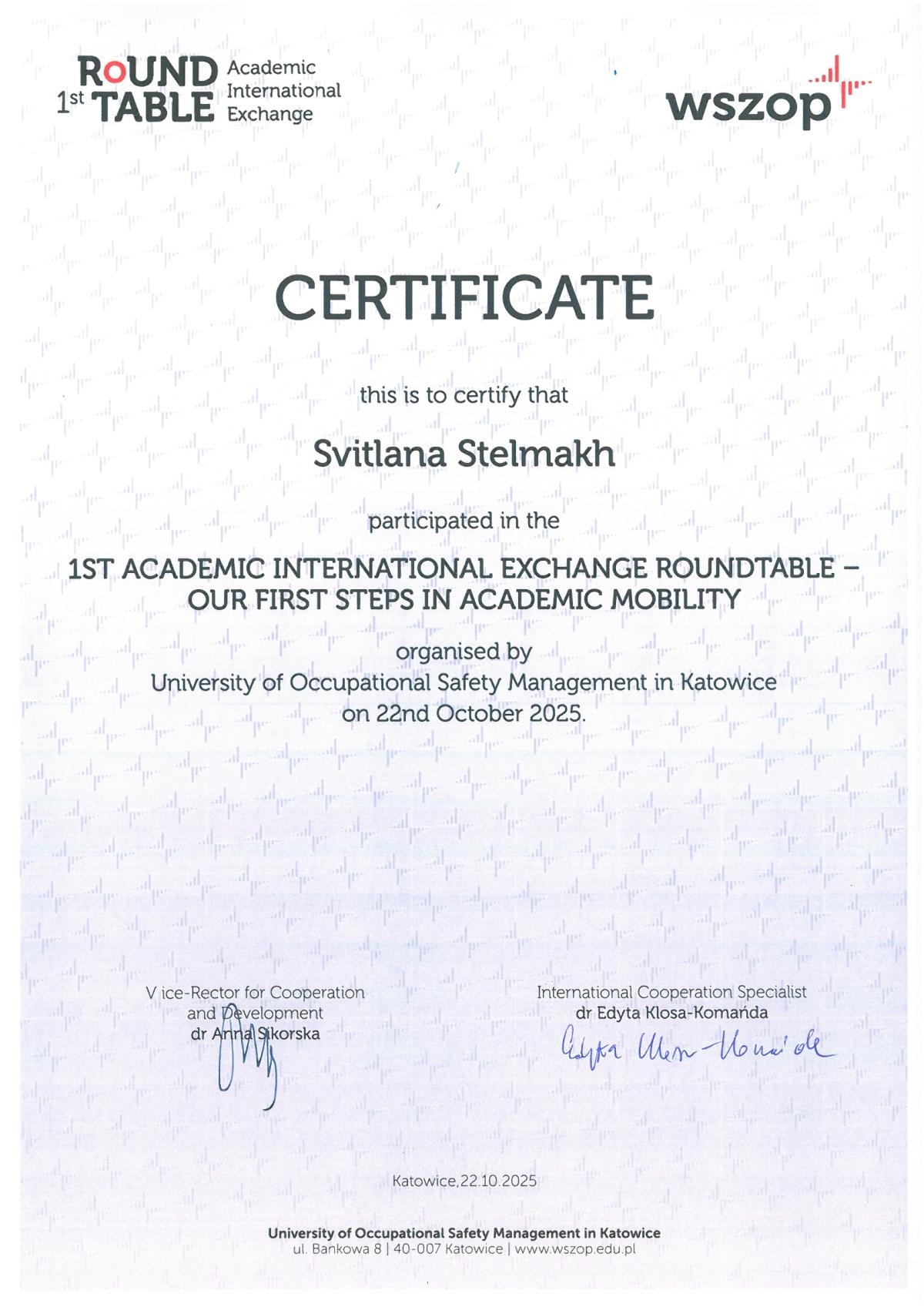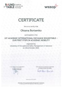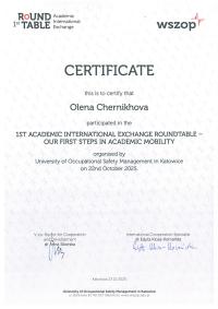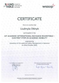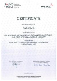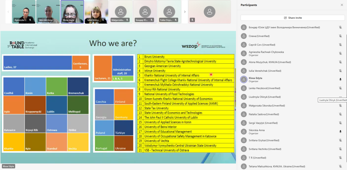 22 жовтня 2025 року представники Кременчуцького льотного коледжу Харківського національного університету внутрішніх справ долучилися до міжнародного круглого столу «Міжнародний академічний обмін: наші перші кроки в академічній мобільності» (1st Round Table – Academic International Exchange: Our first steps in Academic Mobility), проведеного в онлайн-форматі Вищою школою управління охороною праці в Катовіцах (Республіка Польща) - міжнародним партнером ХНУВС.