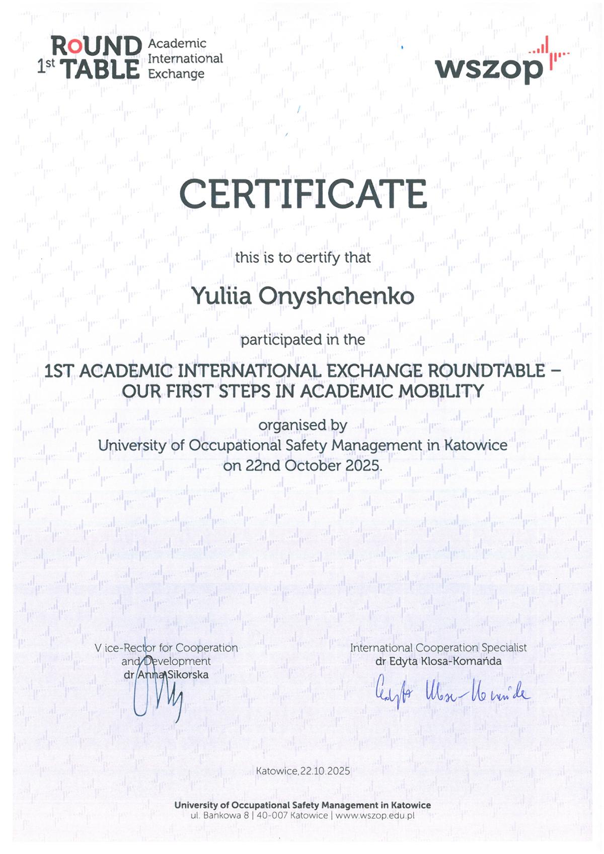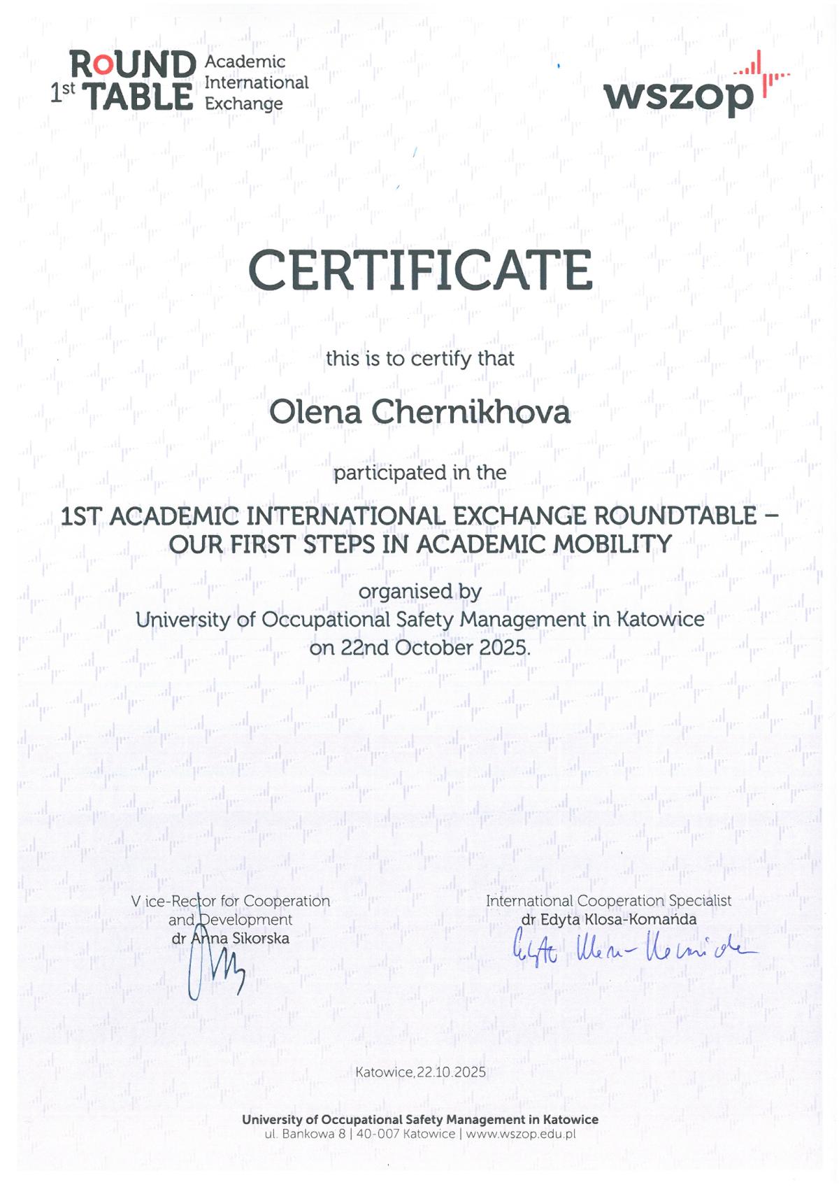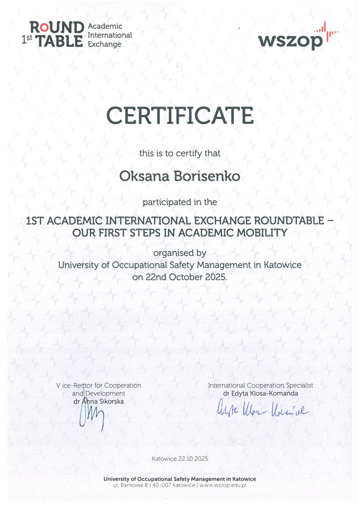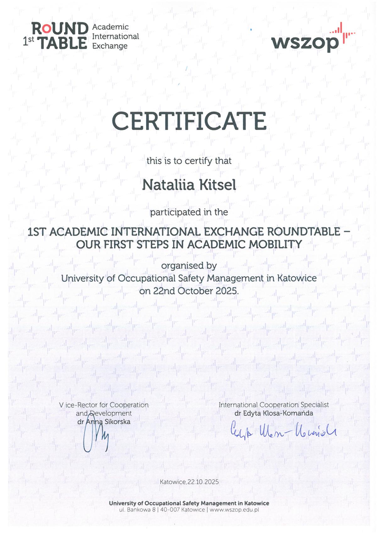 22 жовтня 2025 року представники Кременчуцького льотного коледжу Харківського національного університету внутрішніх справ долучилися до міжнародного круглого столу «Міжнародний академічний обмін: наші перші кроки в академічній мобільності» (1st Round Table – Academic International Exchange: Our first steps in Academic Mobility), проведеного в онлайн-форматі Вищою школою управління охороною праці в Катовіцах (Республіка Польща) - міжнародним партнером ХНУВС.