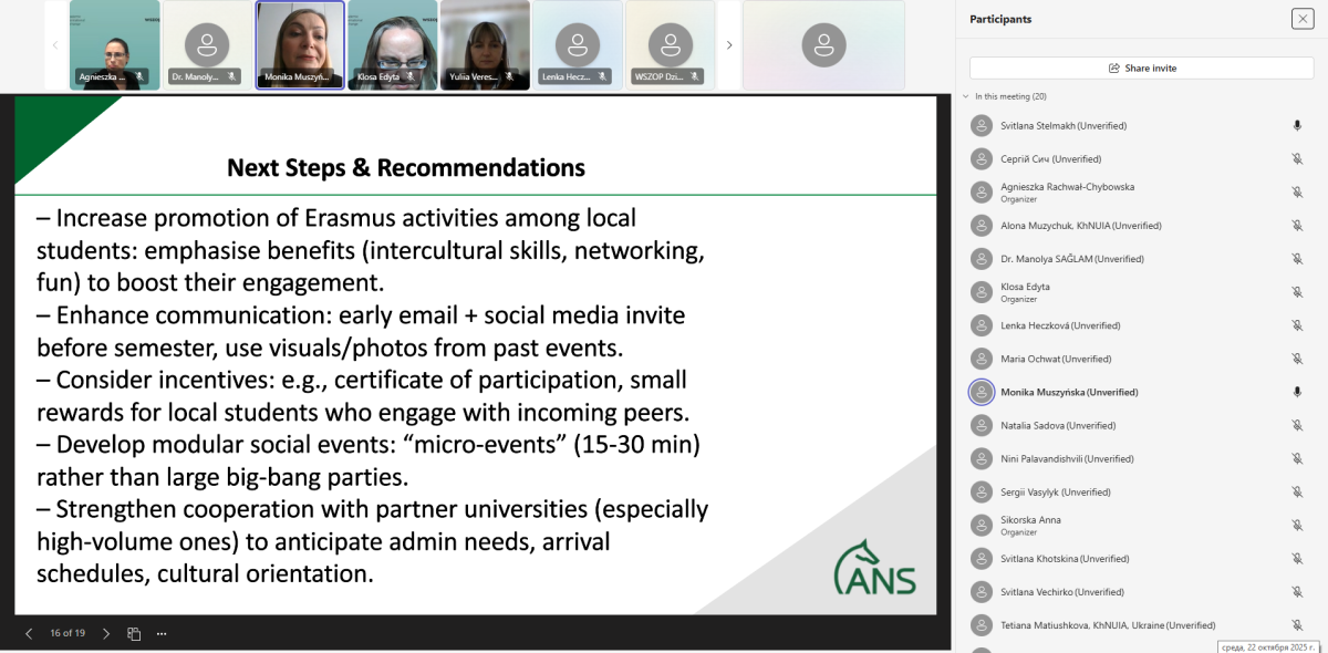 Окрему увагу приділили питанням щодо розвитку міжнародної кредитної мобільності, розширення партнерств із країнами поза межами ЄС, впровадження змішаних інтенсивних програм (Blended Intensive Programmes, BIP), інноваційних методик викладання, а також психологічним аспектам академічного обміну.