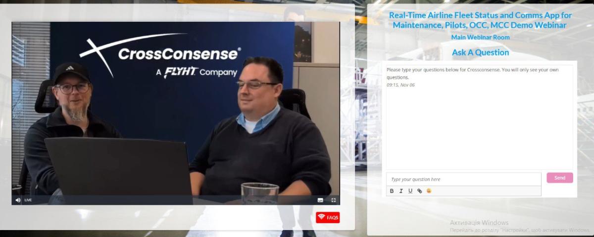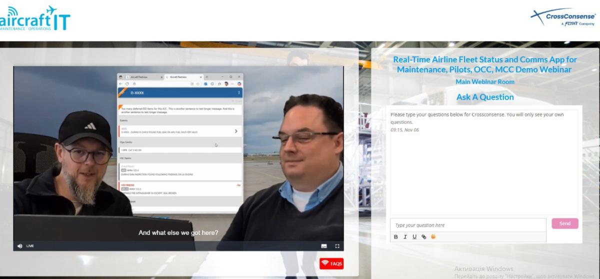 Вебінар був присвячений демонстрації програми Airline Fleet View, яка надає можливість отримувати статус авіапарку в режимі реального часу. Учасники мали можливість ознайомитися з новими функціями програми, зокрема інноваційним In-App Messenger, що дозволяє ключовим працівникам обмінюватися специфічними повідомленнями про повітряні судна безпосередньо в додатку, покращуючи швидкість прийняття рішень перед кожним вильотом.