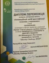 Приємно відзначити, що колектив науковців із НТУ «КПІ імені Ігоря Сікорського», НУ «Полтавська політехніка імені Юрія Кондратюка» і Кременчуцького льотного коледжу ХНУВС, який представляв канд. техн. наук, доцент кафедри авіаційного транспорту Вадим Орел, переміг зі своїм проєктом «Інноваційний засіб ідентифікації осколків у поранених» у секції «Біомедична інженерія та здоров'я людини». Ця розробка набула особливої актуальності в умовах сьогодення і покликана підвищити точність виявлення та розпізнавання осколків у рані пацієнта методом тактильного зондування.