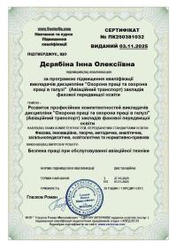 Дєрябіна Інна підвищила кваліфікацію для викладачів дисципліни «Охорона праці та охорона праці в галузі» (Авіаційний транспорт). У процесі навчання викладач удосконалила професійні компетентності щодо: сучасних підходів до організації навчального процесу з охорони праці; нормативно-правового забезпечення безпеки праці в авіаційній галузі; методик оцінювання ризиків та впровадження систем управління охороною праці; застосування інноваційних педагогічних технологій та інтерактивних методів навчання; формування у здобувачів освіти культури безпеки праці відповідно до вимог авіаційного сектору. Отримані знання та навички викладач планує активно впроваджувати у навчальний процес для підвищення якості підготовки здобувачів освіти та їхньої обізнаності з питань безпеки праці в авіаційній сфері.