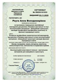 Викладачі кафедри авіаційного транспорту успішно пройшли підвищення кваліфікації в галузі Авіаційного транспорту з 27.10.2025 по 03.11.2025 р.: Реута Алла підвищила кваліфікацію для викладачів дисципліни «Паливно-мастильні матеріали та інші експлуатаційні матеріали» (Авіаційний транспорт). В процесі навчання удосконалила компетентності у галузі зберігання, транспортування та заправлення паливно-мастильними матеріалами, методикою викладання технології зберігання та логістики паливно-мастильних матеріалів. Отримані знання викладач планує впроваджувати в освітній процес для підвищення якості професійної підготовки здобувачів освіти та розвитку їхніх компетентностей у сфері роботи з паливно-мастильними матеріалами.