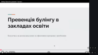 Провідний психолог групи психологічного забезпечення відділу кадрового забезпечення взяла участь в дводенному вебінарі «Школа без цькування», присвяченому темі протидії булінгу в освітньому середовищі, трансляція якого відбулася на ютюб-каналі МОН України.