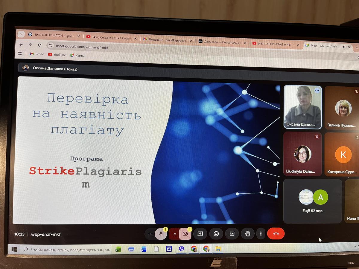 Працівники загальної бібліотеки, відділу організації наукової діяльності, а також завідувачка відділення практичного навчання Кременчуцького льотного коледжу Харківського національного університету внутрішніх справ долучилися до фахового вебінару «StrikePlagiarism як платформа для перевірки на плагіат», організованого Центром забезпечення якості вищої освіти. Захід був спрямований на підвищення рівня обізнаності щодо академічної доброчесності й ефективного використання сучасних інструментів для перевірки оригінальності текстів.