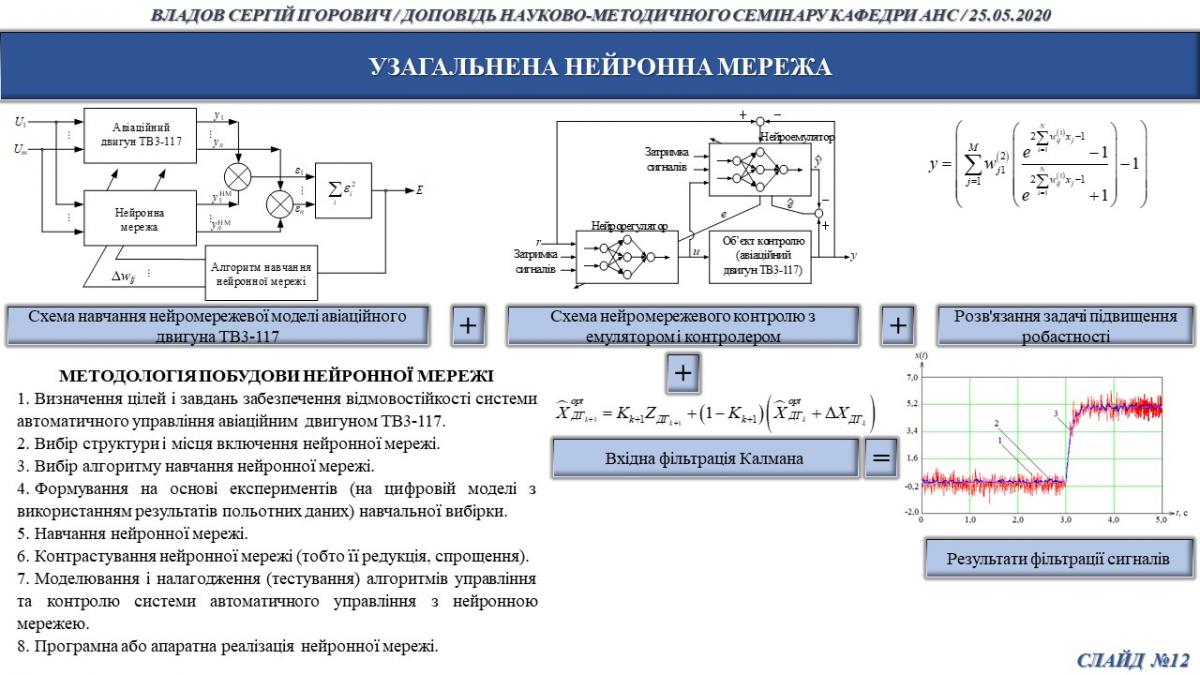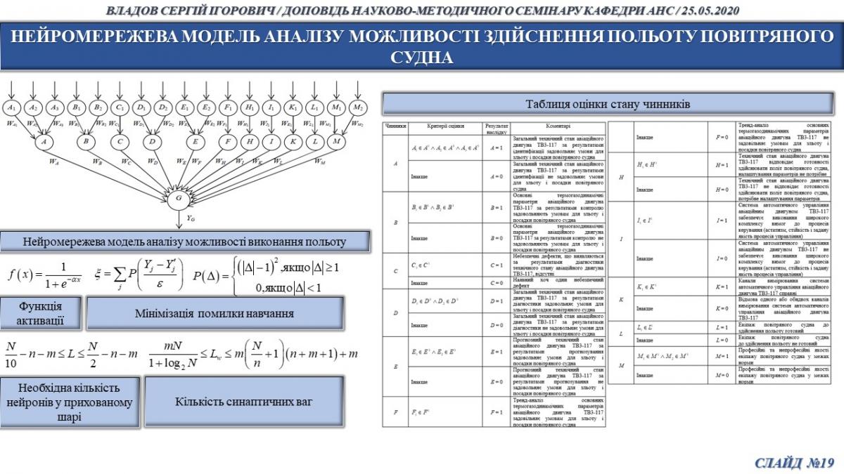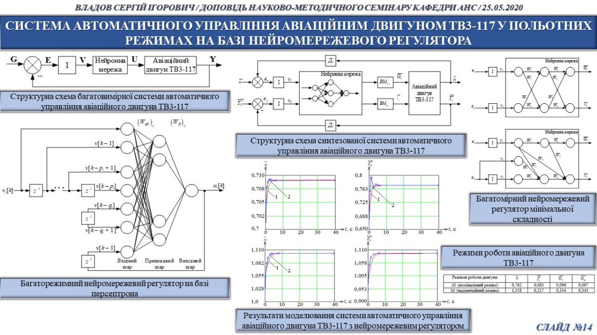 Учасник представив доповідь на тему «Контроль і діагностика технічного стану авіаційного вертольотного двигуна у польотних режимах за допомогою нейромережевих технологій», яка присвячена питанням розробки та удосконалення методології контролю і діагностики технічного стану авіаційного двигуна ТВ3-117 у польотних режимах за допомогою нейромережевих технологій, що дозволяє підвищити якість моніторингу та управління експлуатацією авіаційного двигуна ТВ3-117 у режимі реального часу. Доповідь Владова Сергія викликала широку дискусію з боку учасників семінару. Відмічена актуальність, новизна, логічна послідовність представленої доповіді.