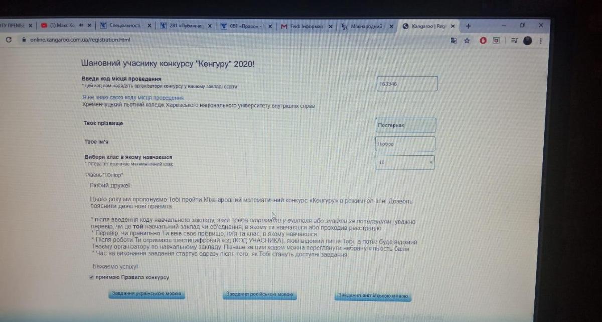 З 22 - 24 травня 2020 року у форматі on-line 92 курсанта Кременчуцького льотного коледжу ХНУВС взяли участь в Міжнародному математичному конкурсі «Кенгуру» у віковій групі «Юніор». Під керівництвом координатора конкурсу к.е.н., керівника наукового відділу Петченко Марини Валентинівни та викладачів математики Пилипенко Людмили Миколаївни, Назаренко Надії Петрівни. Метою конкурсу є зацікавлення учасників математикою та об’єднання навколо вирішення спільних проблем вчителів математики з різних областей України.