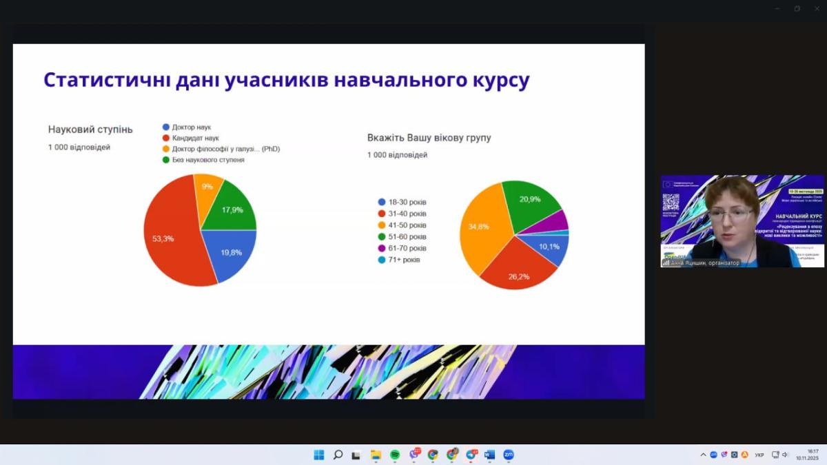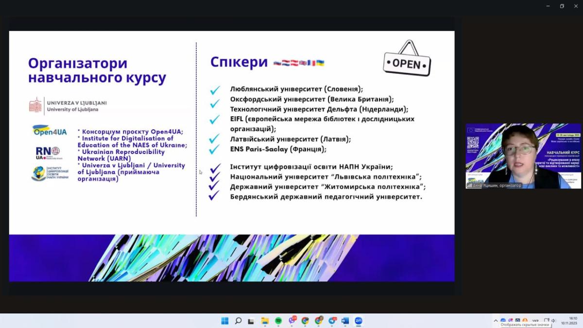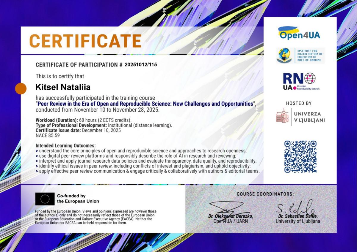 З 10 по 28 листопада 2025 року начальниця відділу організації наукової діяльності Людмила Олійник, завідувачка відділення практичного навчання Оксана Борисенко та наукова співробітниця відділу організації наукової діяльності Наталія Кіцель пройшли Міжнародне підвищення кваліфікації прослухавши курс «Рецензування в епоху відкритої та відтворюваної науки: нові виклики та можливості».