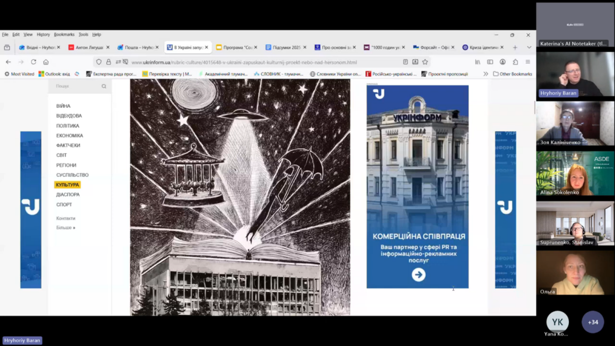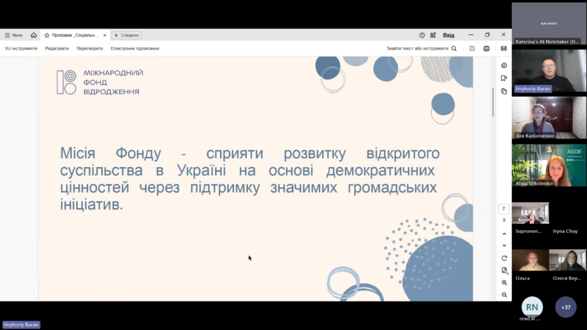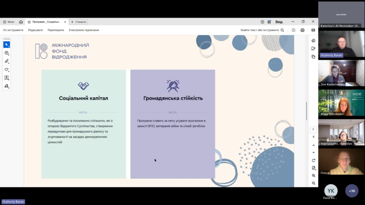 Основною темою зустрічі була практична робота з вразливими групами населення, акцентуючи увагу на зміцненні стійкості громад і підтримці дітей у подоланні травматичного досвіду. Експерти підкреслили важливість ролі культури, творчості та освіти у соціальній інтеграції та розвитку молоді. Під час вебінару учасники отримали цінний міжнародний досвід і рекомендації щодо впровадження сучасних психолого-педагогічних практик у виховний процес. Своїм досвідом та інноваційними підходами до роботи з громадою поділилися авторитетні спікери: Станіслав Супруненко (Ukrainian Arts Hub, ЄБРР), Ольга Балашова (ГО МСМ / UMCA) та Григорій Баран (МФ «Відродження»).