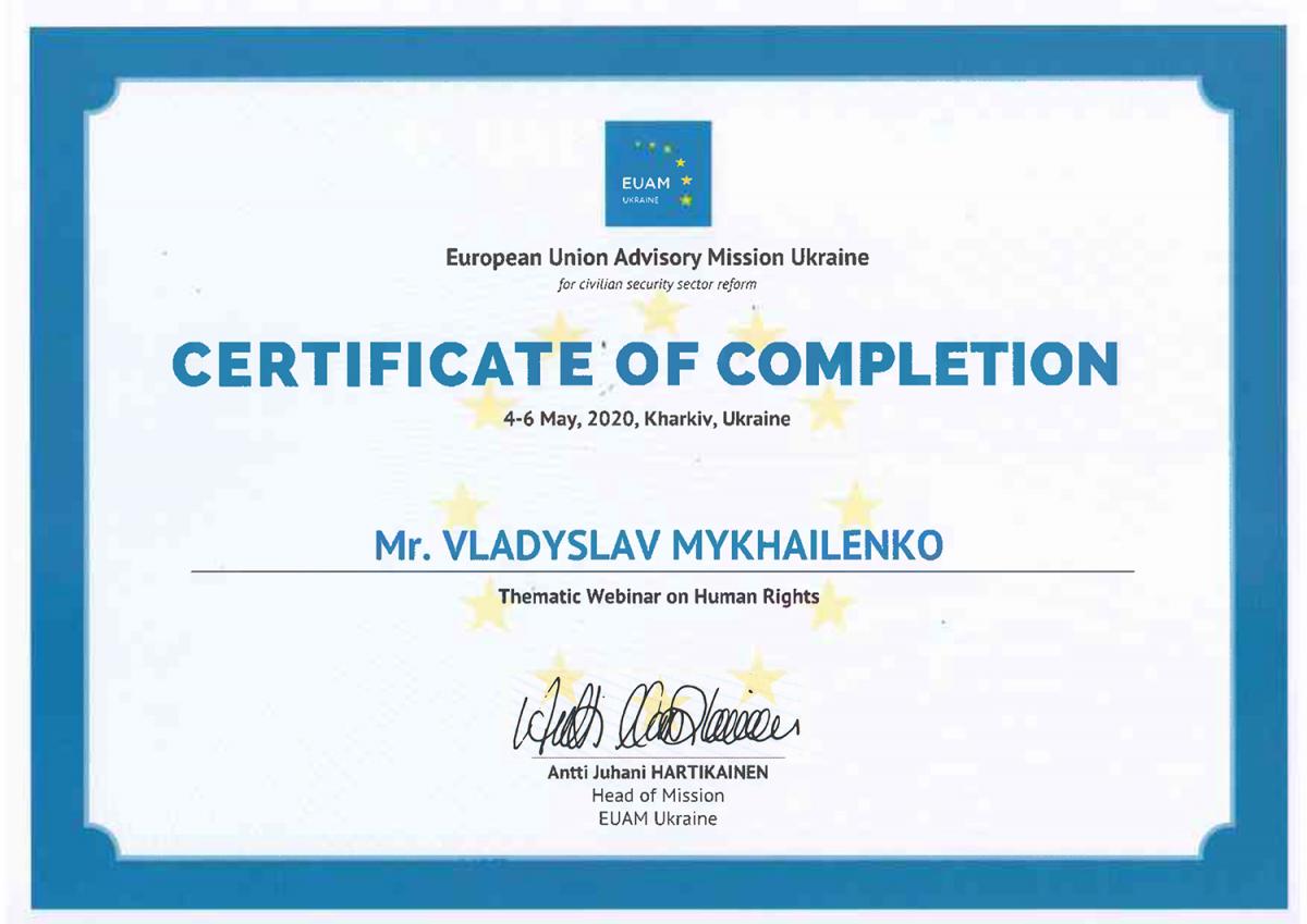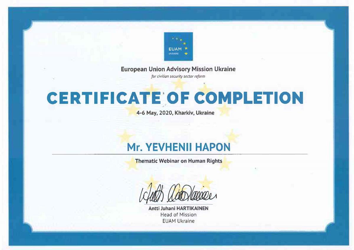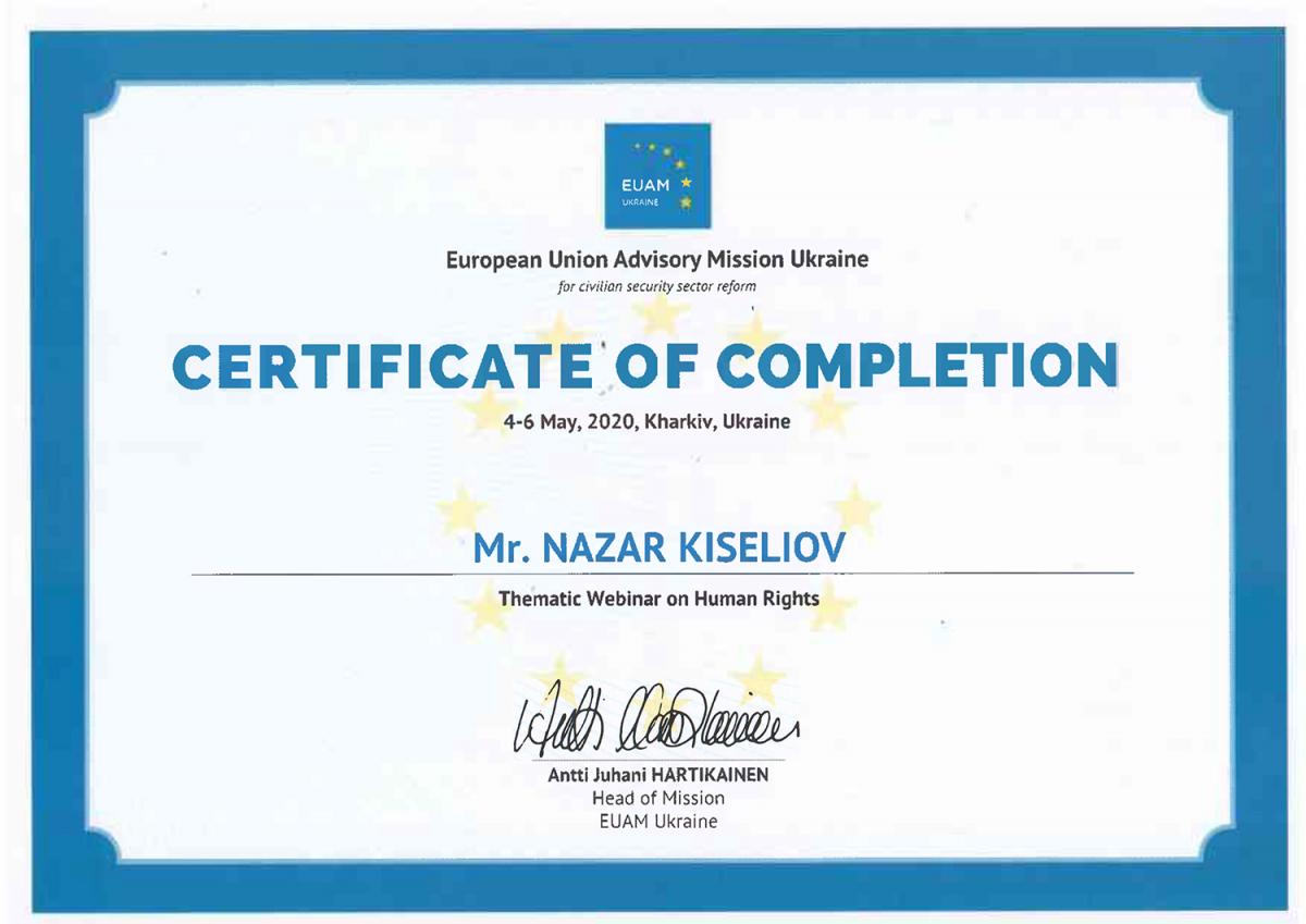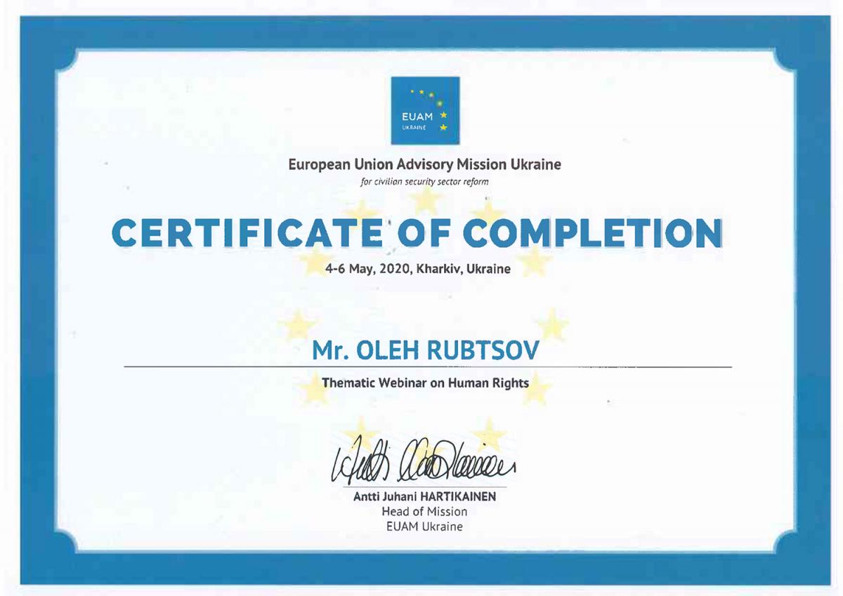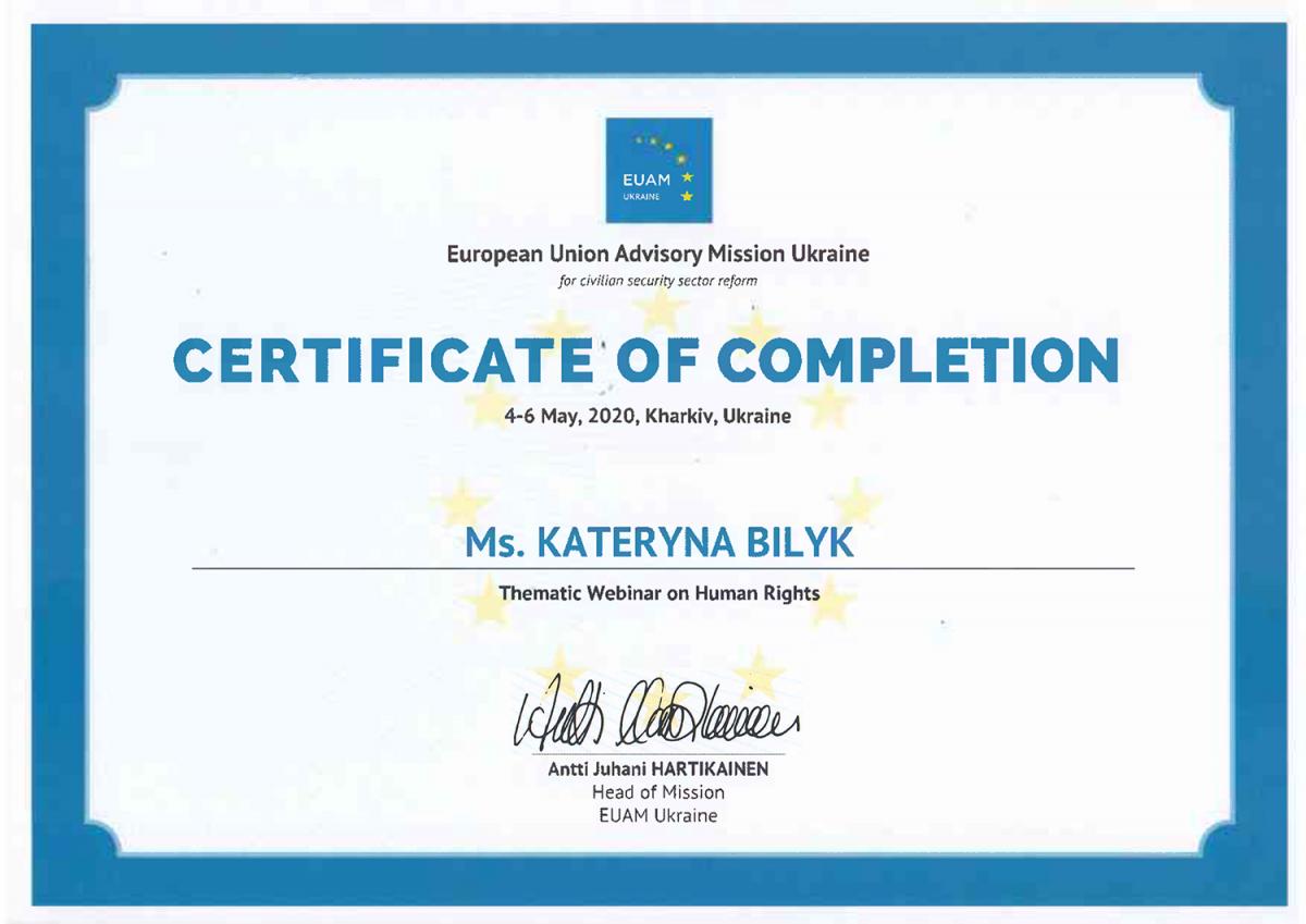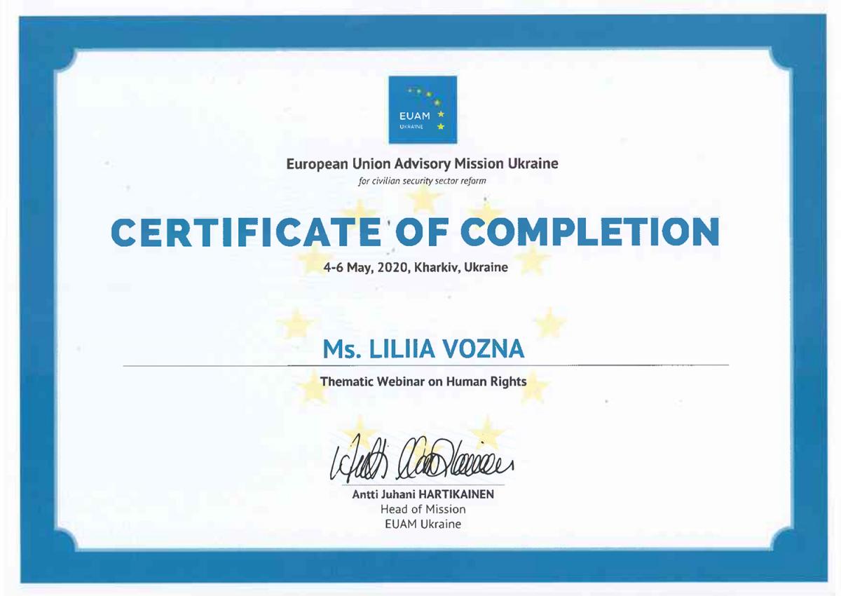 За активну участь у вебінарах, організованих відділом міжнародного співробітництва Харківського національного університету внутрішніх справ, викладач циклової комісії української та англійської мов Людмила Чижова і курсанти Назар Кісельов, Катерина Білик, Владислав Михайленко, Роман Цибульняк, Лілія Возна, Дмитро Ходін, Олег Рубцов, Євгеній Гапон Кременчуцького льотного коледжу отримали сертифікати учасників.