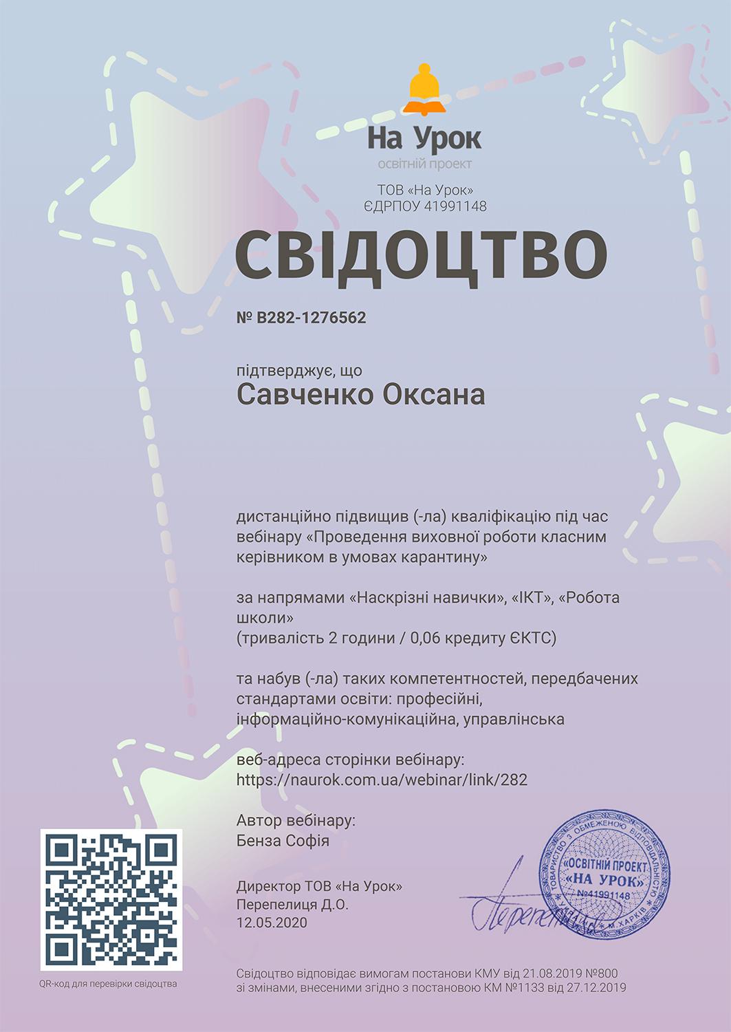 Викладач циклової комісії української та іноземної мов Кременчуцького льотного ХНУВС Оксана Савченко взяла участь в онлайн-вебінарах “Проведення виховної роботи класним керівником в умовах карантину” та “Сучасний урок: у пошуках натхнення”, які були проведені Освітнім проєктом “На Урок”. Під час прямого ефіру Софія Бенза у форматі вебінару розкрила такі питання, як : класне керівництво в умовах карантину; організація активу навчальної групи дистанційно, використання сервісу LinkChat; соціальні мережі як помічники у виховній роботі (Instagram, Facebook, TikTok, Discord); реалізація виховної години в онлайн-режимі; взаємодія: викладач — студенти (курсанти) - батьки.