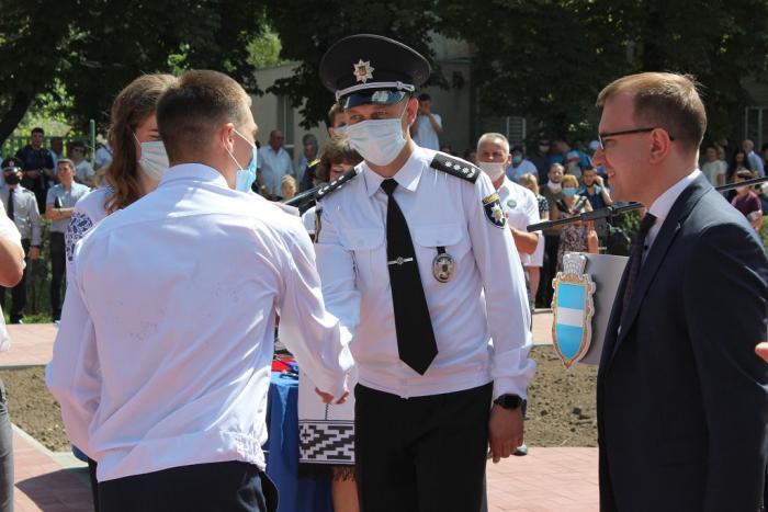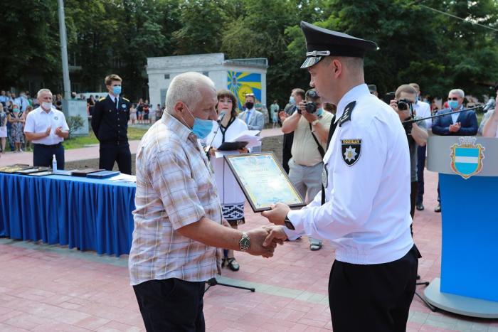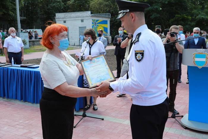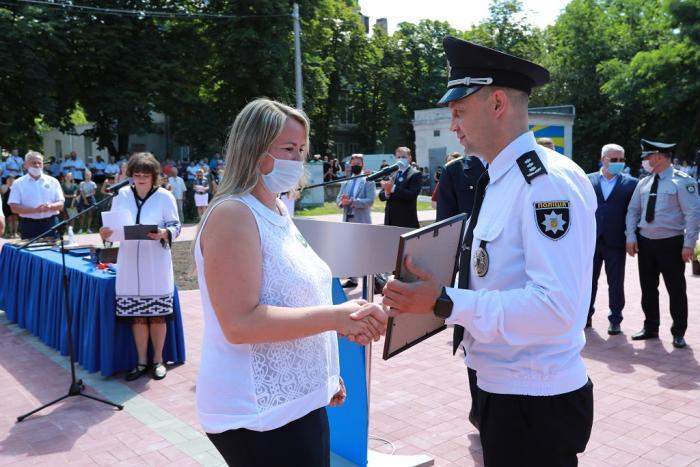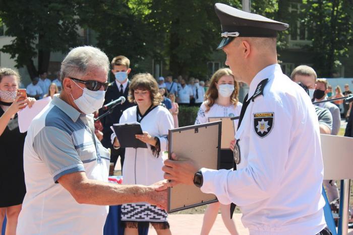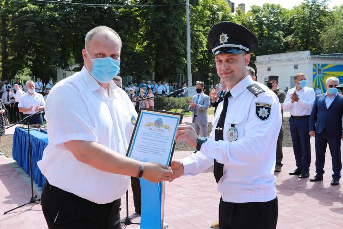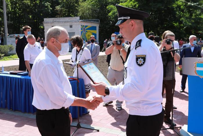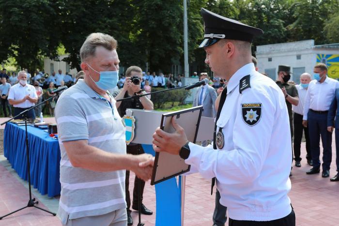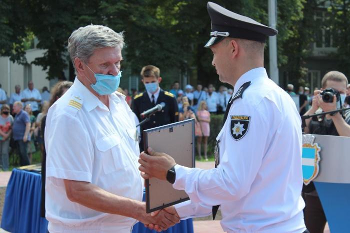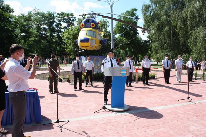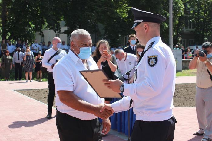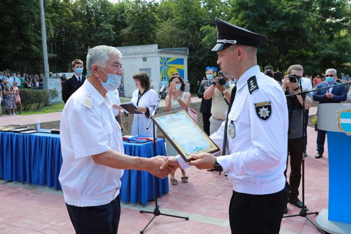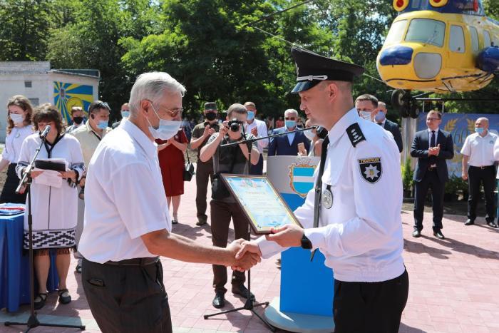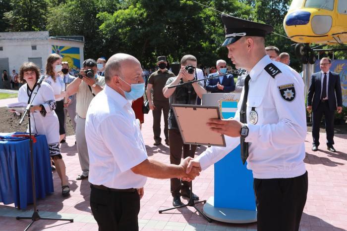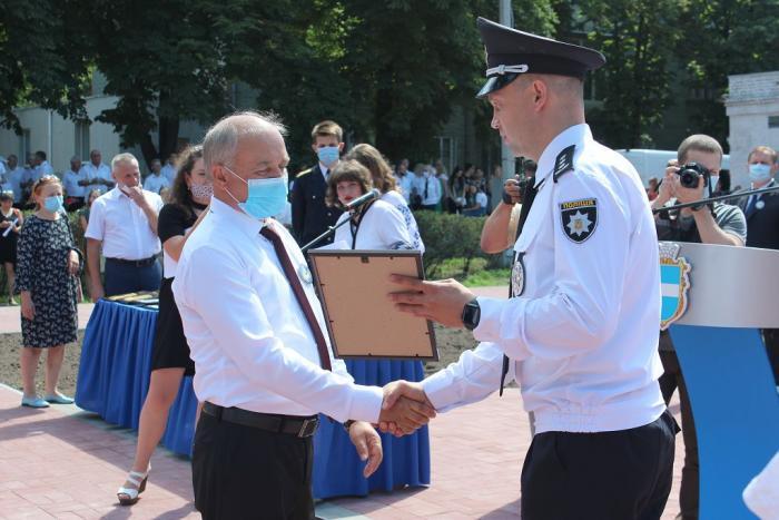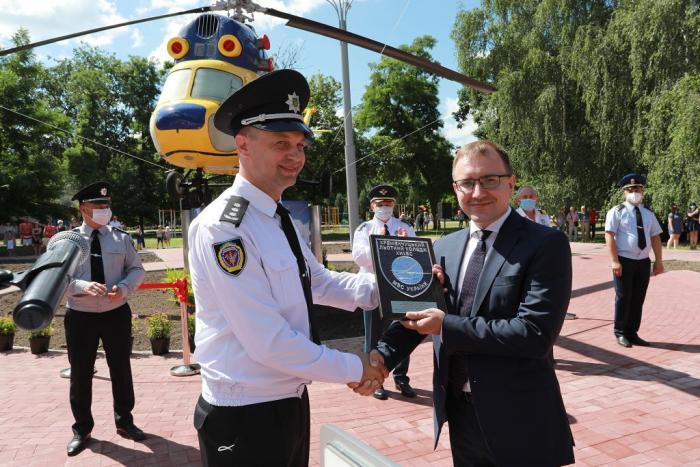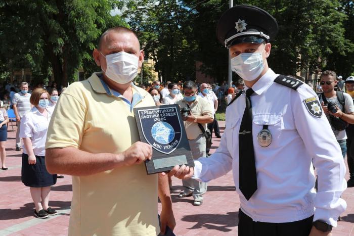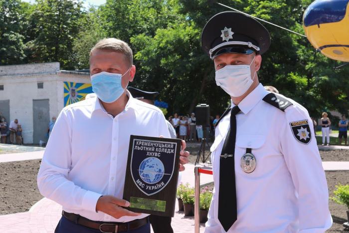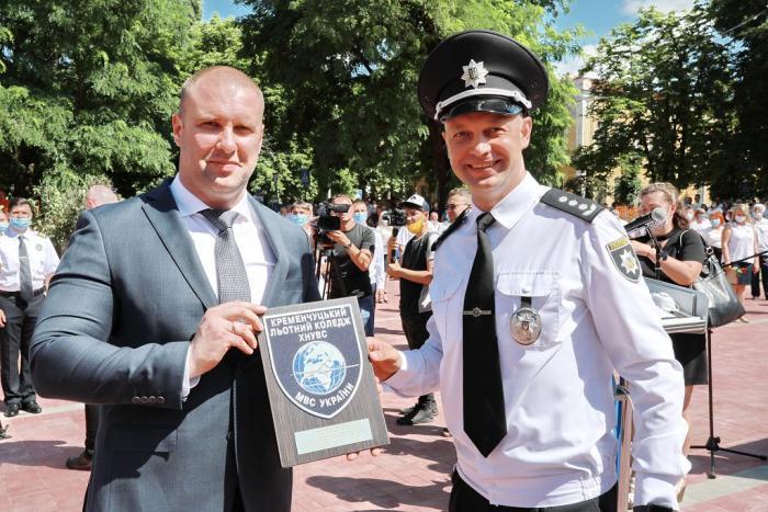 Пам’ятний знак Кременчуцького льотного коледжу Харківського національного університету внутрішніх справ Дмитро Швець вручив голові Полтавської обласної державної адміністрації – випускнику університету, а згодом – колезі, який багато років поспіль працював у виші, – Олегу Синєгубову.