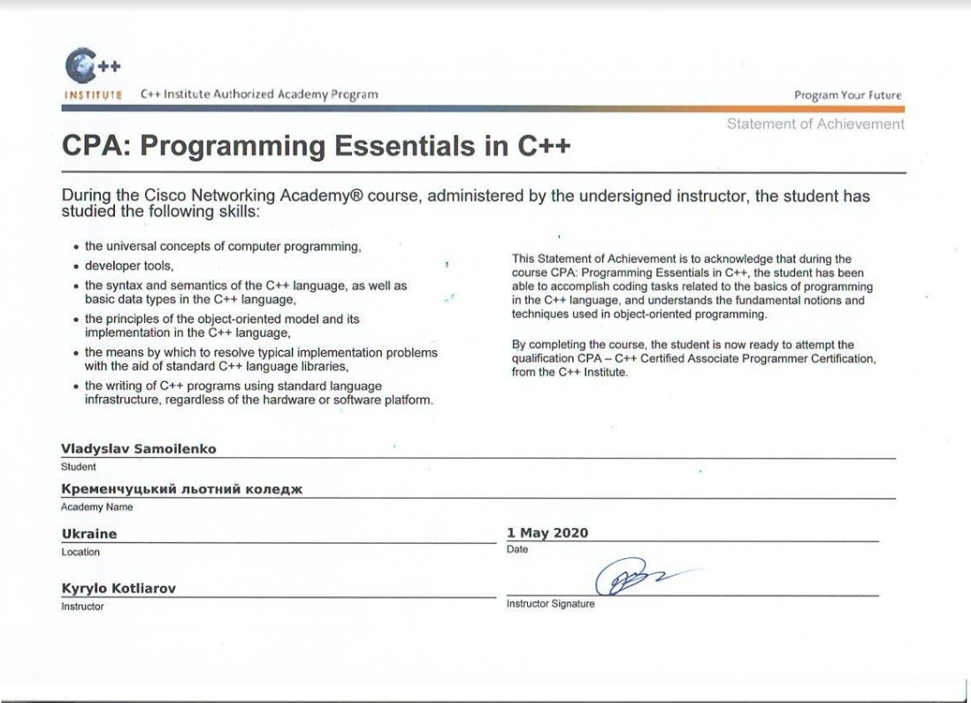 Курсант Кременчуцького льотного коледжу Харківського національного університету внутрішніх справ Владислав Самойленко отримав сертифікат від американської транснаціональної корпорації CISCO за освоєний онлайн-курс CPA: Programming Essentials in C++. CPA: Programming Essentials in C++ є однією з найбільш популярних мов програмування. Безкоштовні курси Мережної академії CISCO для учасників освітнього процесу (курсантів, студентів, викладачів) відкриті на базі коледжу у жовтні 2019 року. Набуті курсантом знання та навички є затребуваними у галузі інформаційної безпеки, побудови мереж та інтернету і будуть використані в навчальній та науковій діяльності.