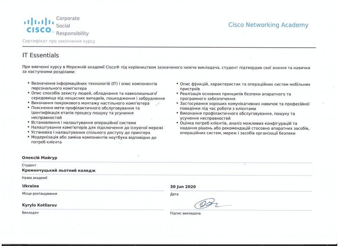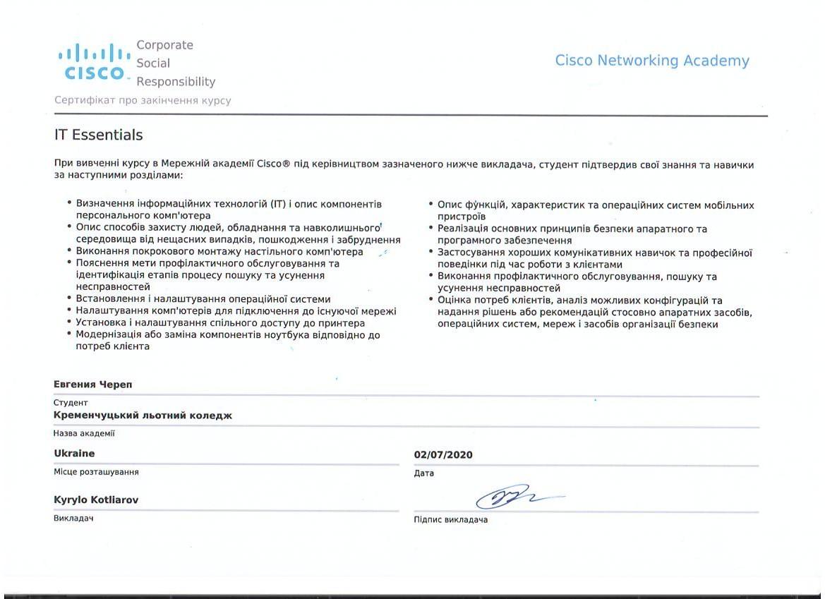 Вітальні листи, а також сертифікати отримали: викладач коледжу Віталій Москалик, курсанти Олексій Майгур, Денис Борисенков та Євгенія Череп. Безкоштовні курси Мережної академії CISCO для учасників освітнього процесу (курсантів, студентів, викладачів) були відкриті на базі коледжу у жовтні 2019 року. Набуті учасниками компетенції будуть використані в навчальній та науковій діяльності.
