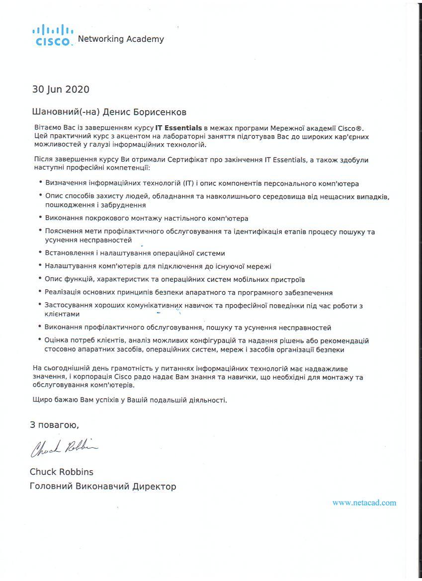 Викладачі та курсанти Кременчуцького льотного коледжу Харківського національного університету внутрішніх справ отримали листи з привітаннями від головного виконавчого директора корпорації CISCO Чака Роббінса з нагоди успішно освоєного онлайн-курсу IT Essentials.