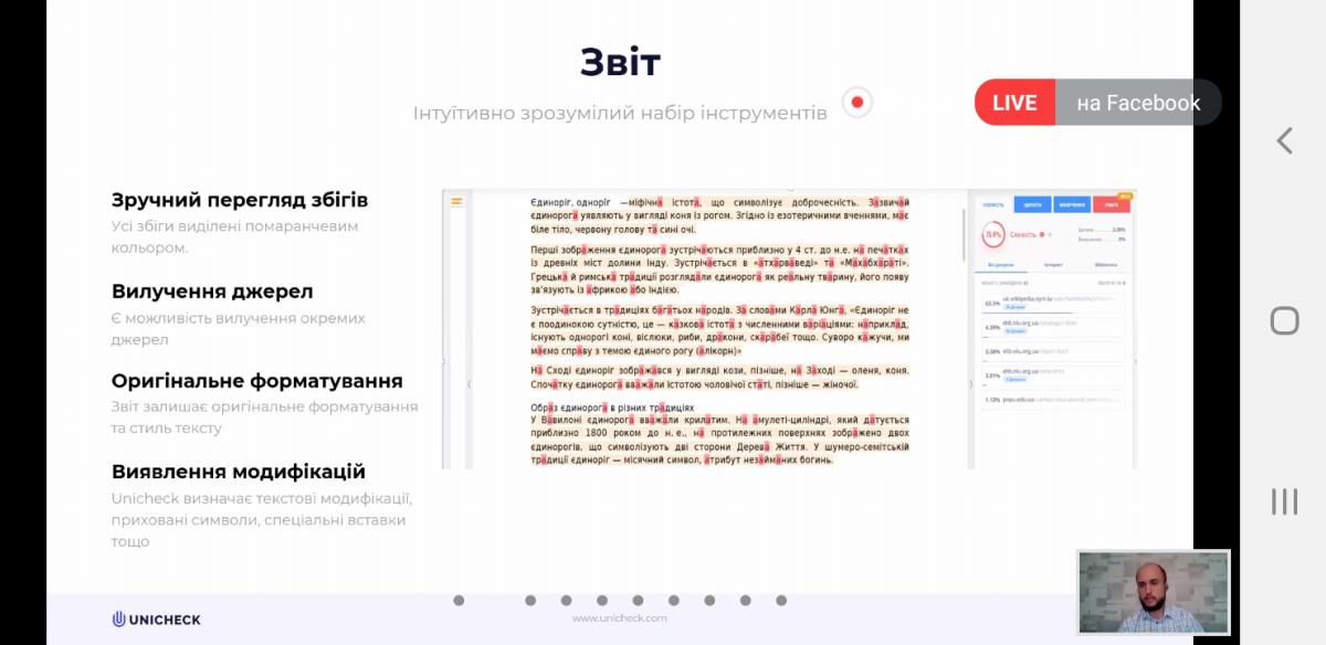 Під час вебінару були розглянуті наступні питання: академічна доброчесність; плагіат у наукових доробках; відмінні та схожі риси поняття «плагіат» та поняття «академічний плагіат»; як виявити «хижацькі» конференції; перевірка наукових робіт на Unicheck тощо.