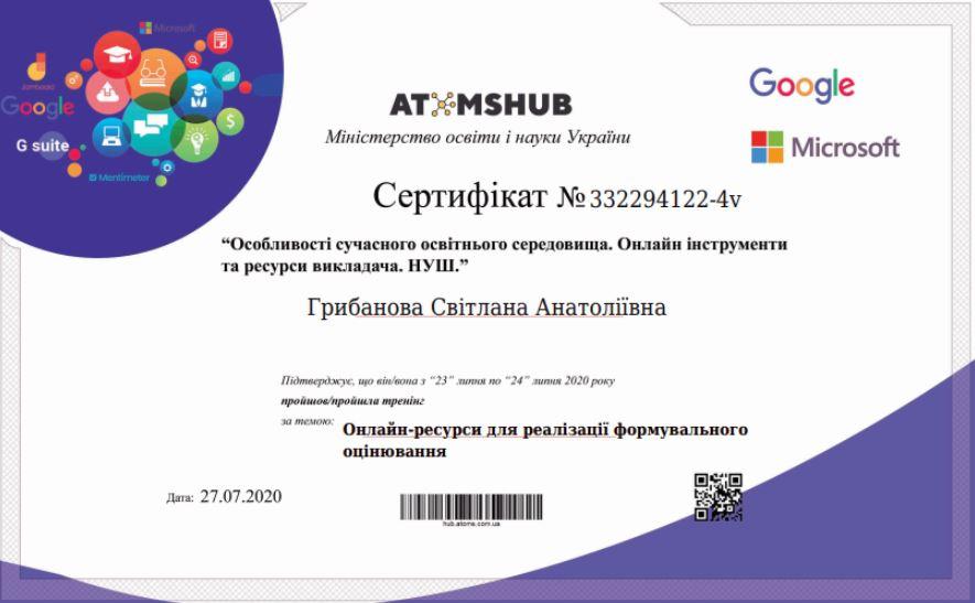 Викладачка циклової комісії природничих дисциплін Кременчуцького льотного коледжу Харківського національного університету внутрішніх справ викладачка-методист Світлана Грибанова взяла участь у Всеукраїнській практичній онлайн-конференції «Особливості сучасного освітнього середовища. Онлайн інструменти та ресурси викладача. НУШ» і тренінгу на тему «Онлайн-ресурси для реалізації формувального оцінювання».