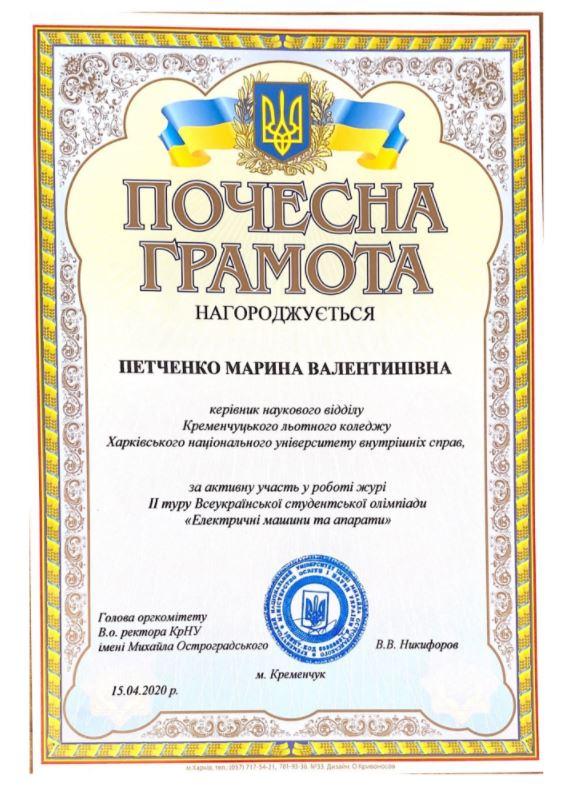 Начальник наукового відділу Кременчуцького льотного коледжу Харківського національного університету внутрішніх справ Марина Петченко отримала почесну грамоту за активну участь у роботі журі ІІ туру Всеукраїнської студентської олімпіади «Електричні машини та апарати», що проходила в Кременчуцькому національному університеті імені Михайла Остроградського.