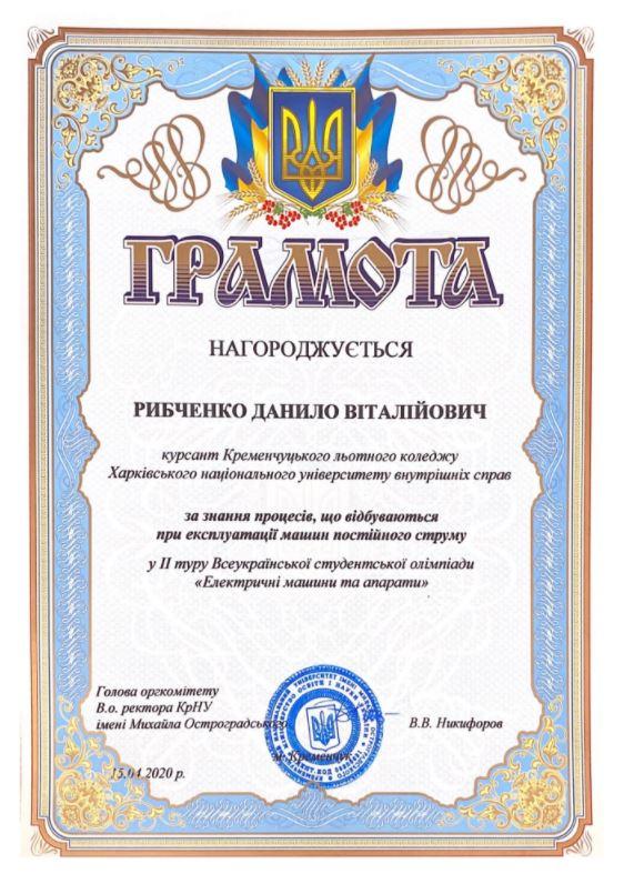 Курсант Кременчуцького льотного коледжу Харківського національного університету внутрішніх справ Данило Рибченко отримав грамоту у ІІ турі Всеукраїнської студентської олімпіади «Електричні машини та апарати» за знання процесів, що відбуваються при експлуатації машин постійного струму.