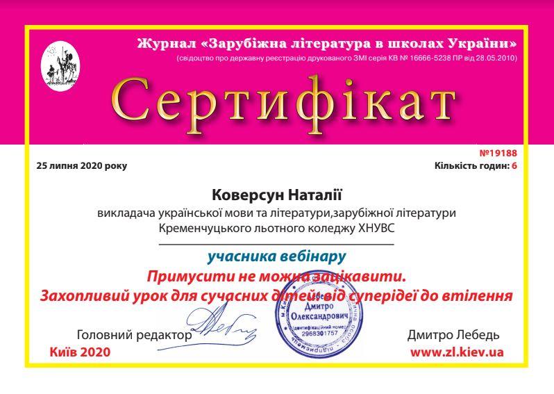 Викладач циклової комісії філологічних дисциплін Кременчуцького льотного коледжу Харківського національного університету внутрішніх справ Наталія Коверсун взяла участь у вебінарі на тему «Примусити не можна зацікавити. Захопливий урок для сучасних дітей: від суперідеї до втілення».
